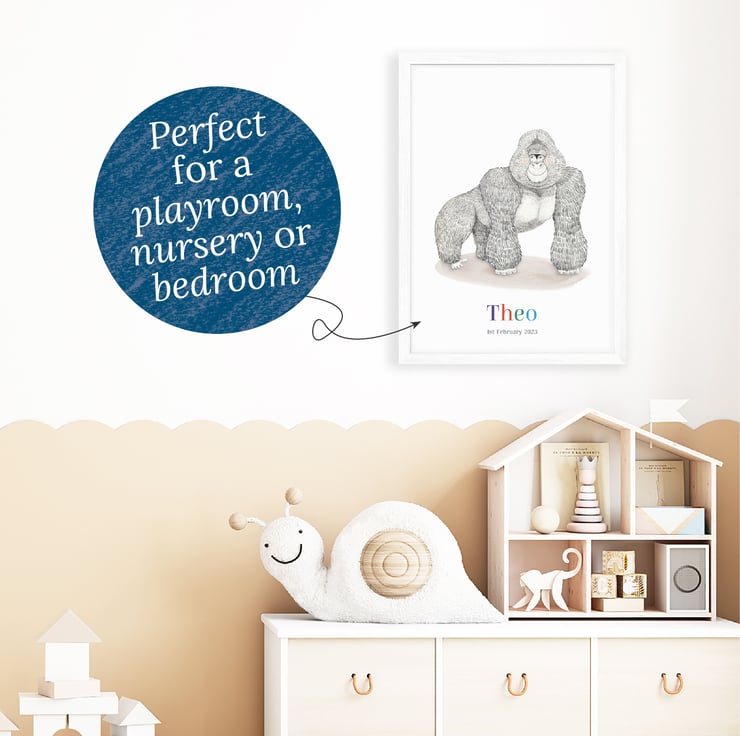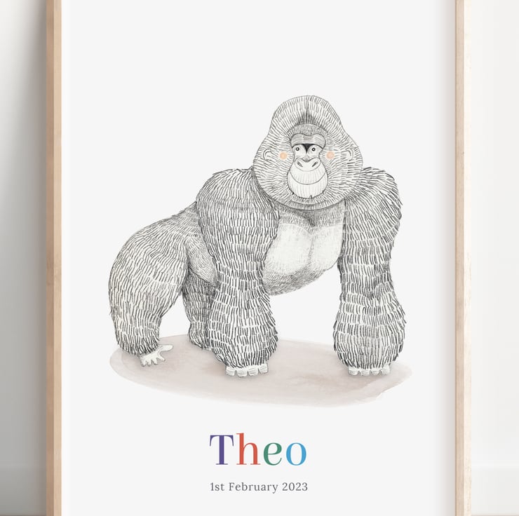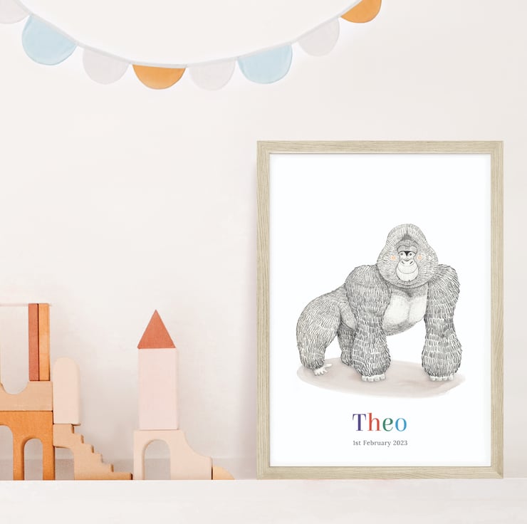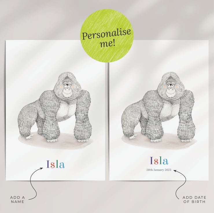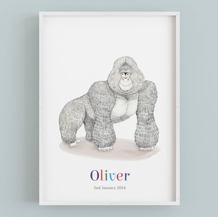 Bring the wild into your kid's room with a personalised gorilla art print! It would make a fantastic gift for a little one’s birthday and can be customised with a name and date of birth to make a unique piece of art for their room.