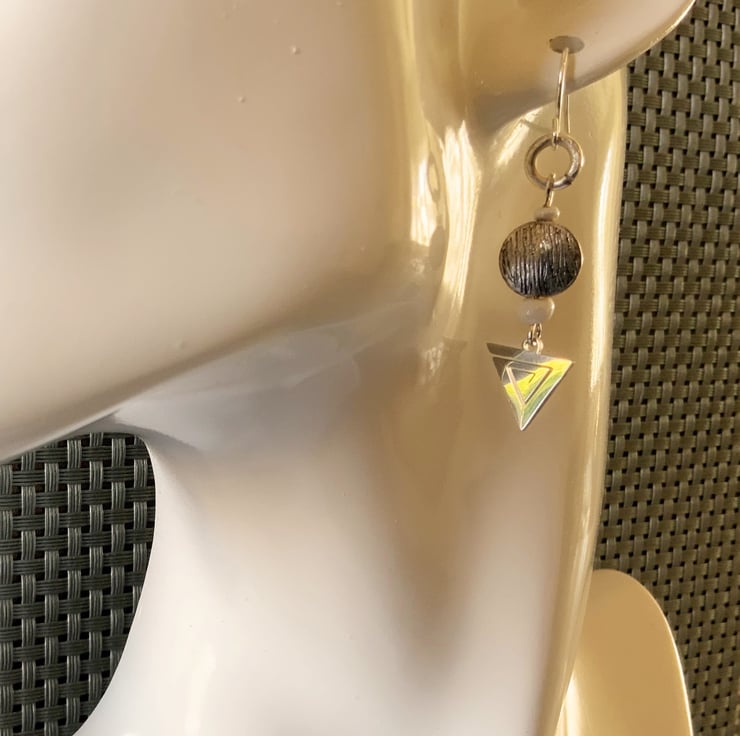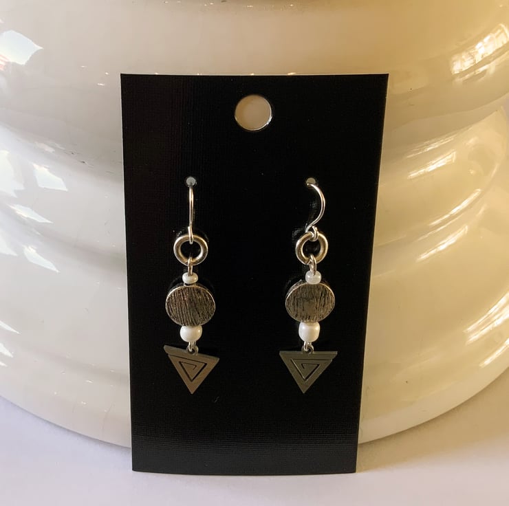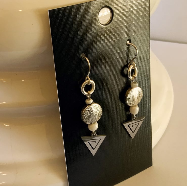 These earrings feeature hammered round flat antique silver colour beads with pearl white rochelle beads. The triangle charm has a very modern maize design. Reflects beautifully in the light.