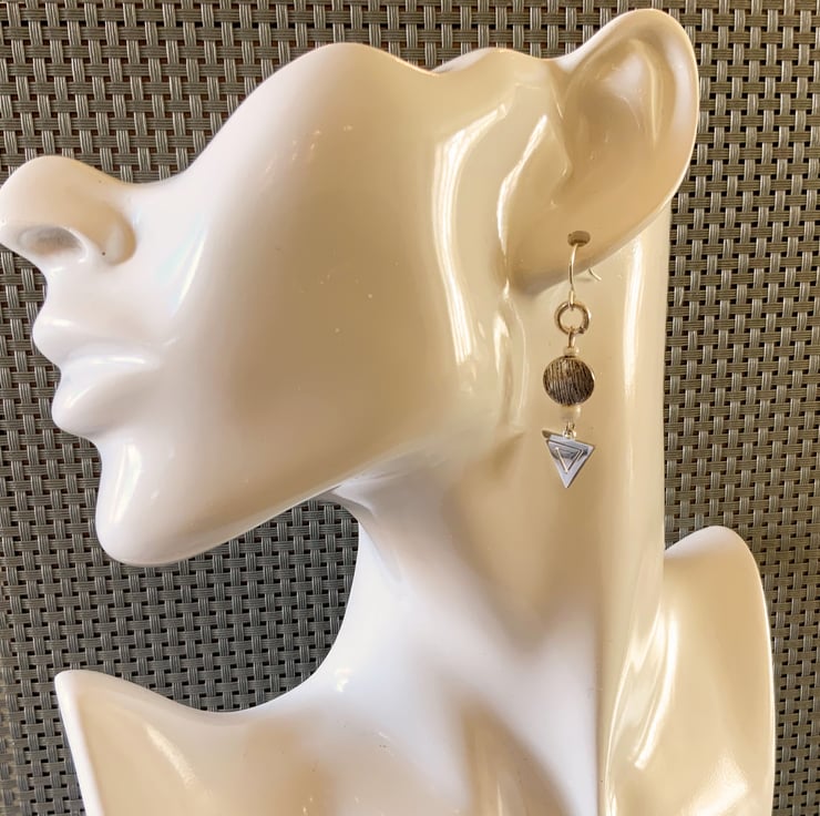 These earrings feeature hammered round flat antique silver colour beads with pearl white rochelle beads. The triangle charm has a very modern maize design. Reflects beautifully in the light.