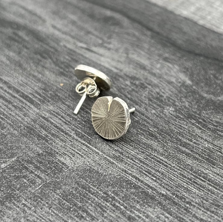 These simple, Sterling Silver Lily pad studs have engraved detail. They measure approximately: 1cm in width and have Sterling Silver posts and backs.