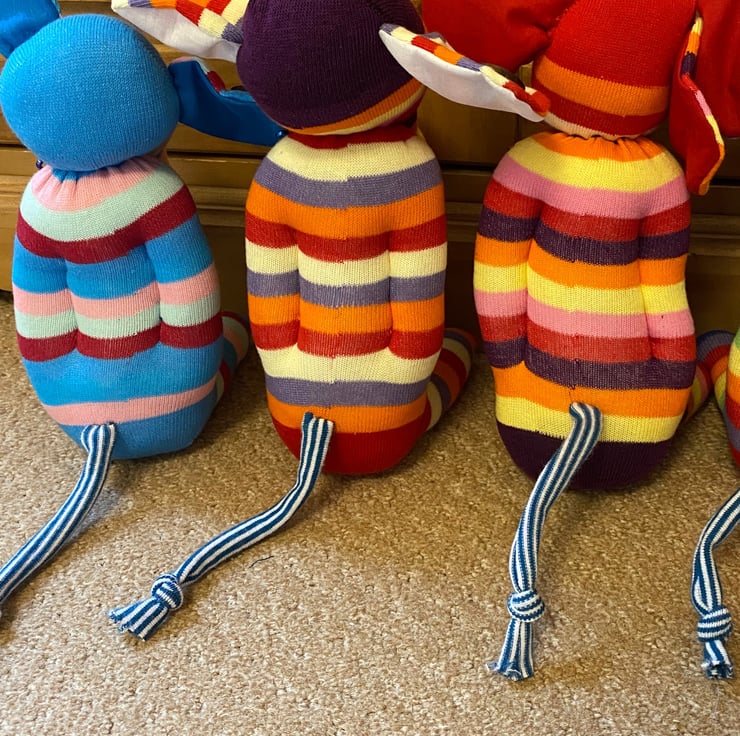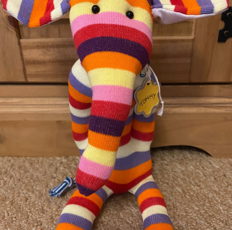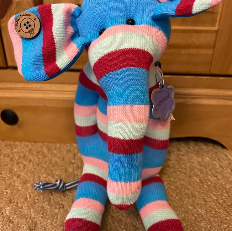 These adorable sock elephants have been made by hand with colourful striped socks. Each measures 9” and as you can see have their own uniqueness and character.