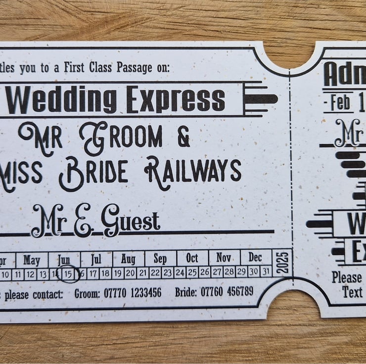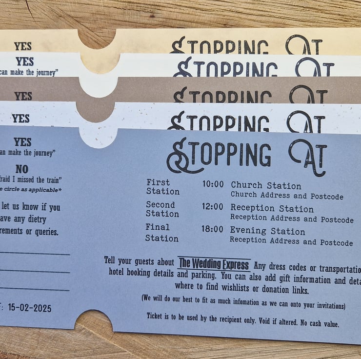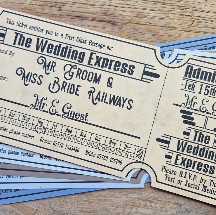 Vintage Train 'ticket' wedding invitations - designed, printed and packaged by us!