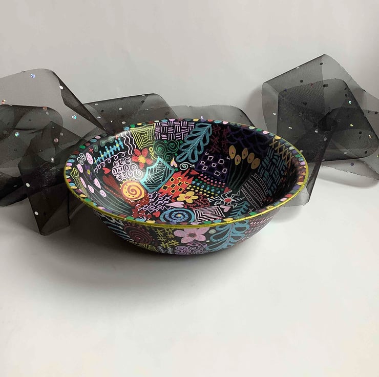 This round bamboo bowl has been cleaned and up cycled to its bold and beautiful form. Lots of vibrant and abstract patterns inside and out.