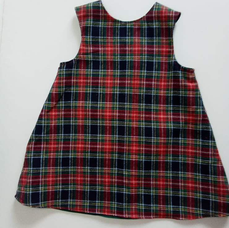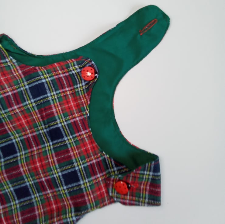 Red Tartan A- line style dress/pinafore with ladybird buttons in brushed cotton.