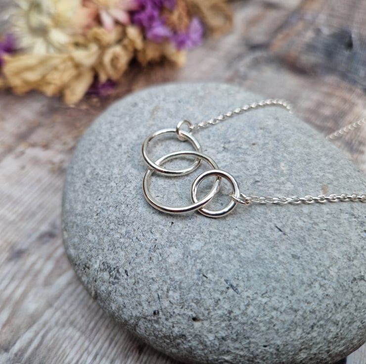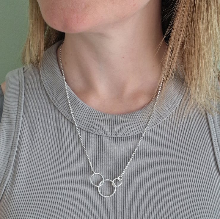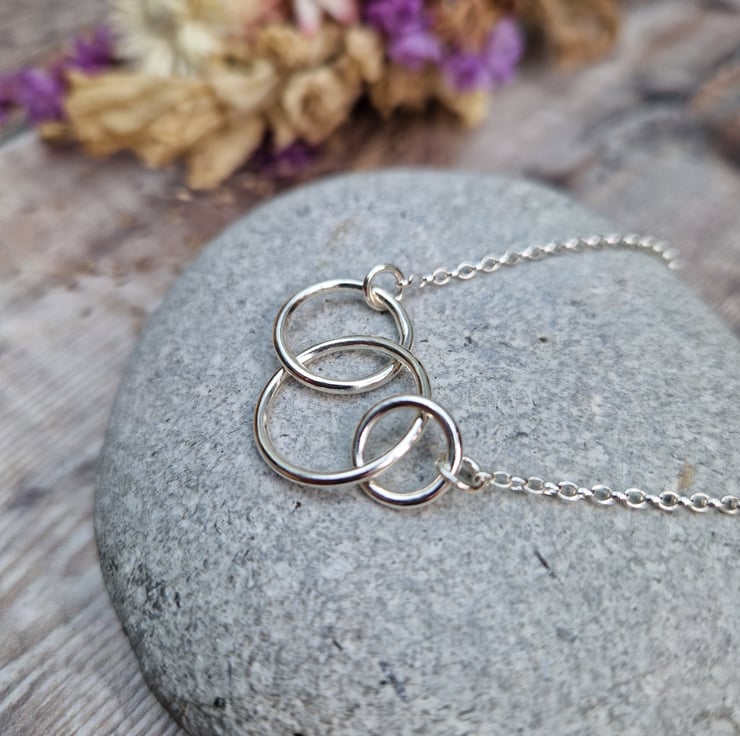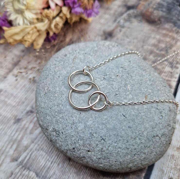 This handmade recycled sterling silver necklace features three interlocking circles, each one representing connection, unity, and love. Whether symbolising family bonds, friendship, or life's journey, this timeless design carries deep meaning in its simplicity.