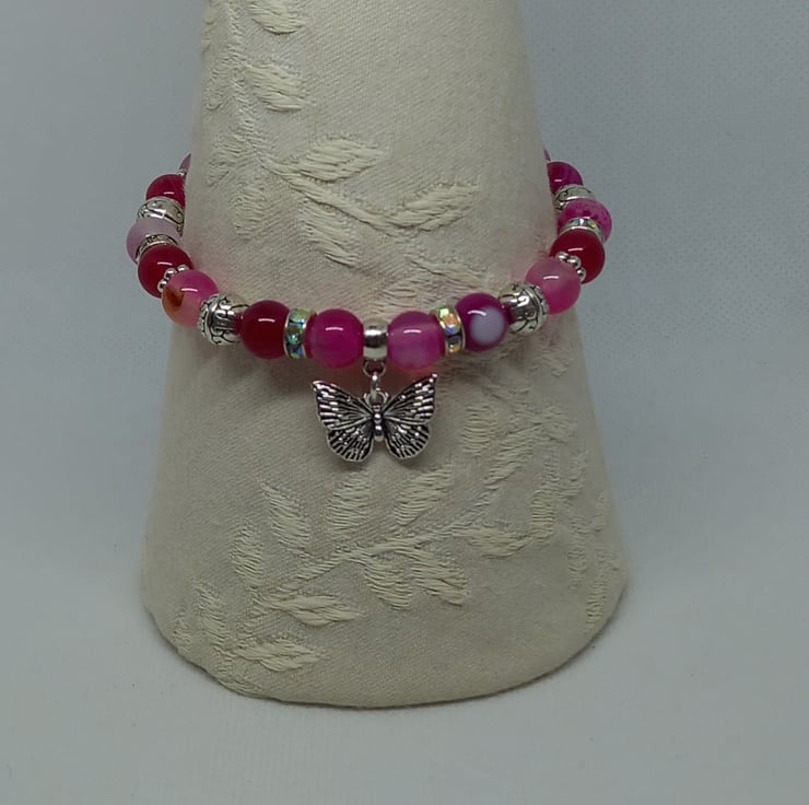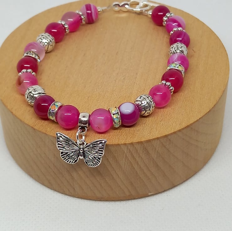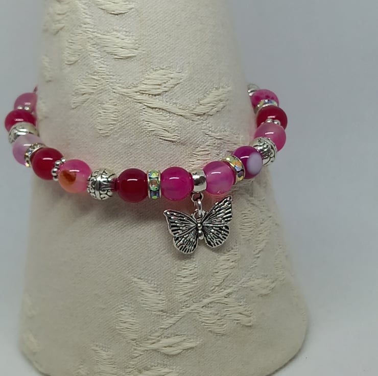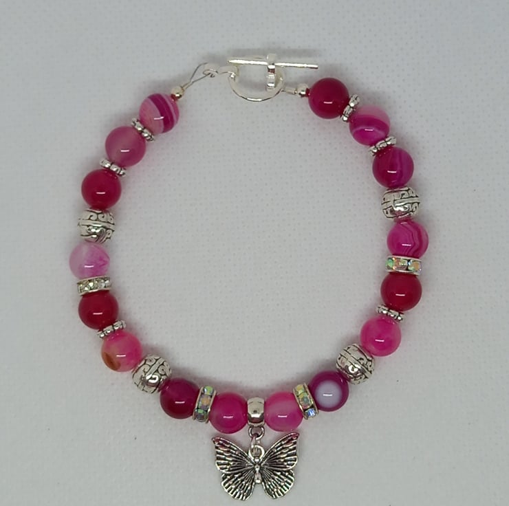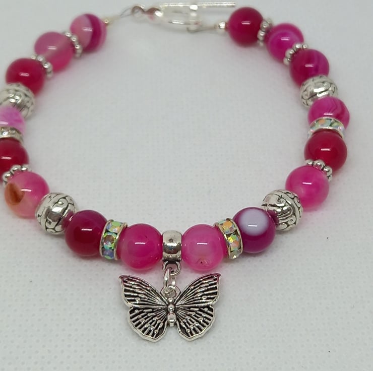 A pretty bracelet made up of 8mm pink agate in varying tones, complemented by diamante spacers, tibetan silver beads and daisy spacers. Features a filigree butterfly charm and fastens with a toggle clasp.