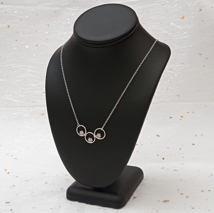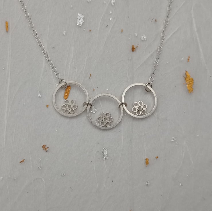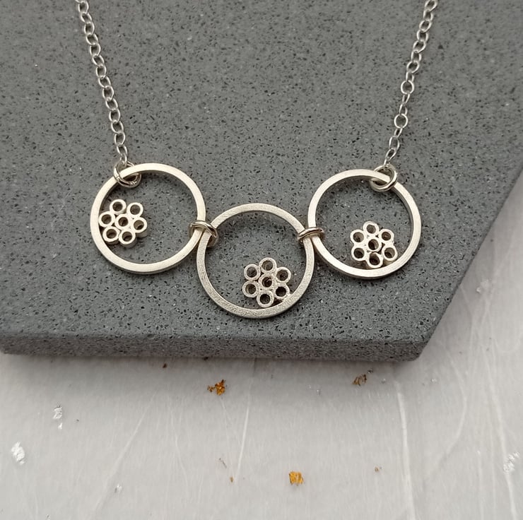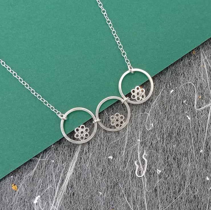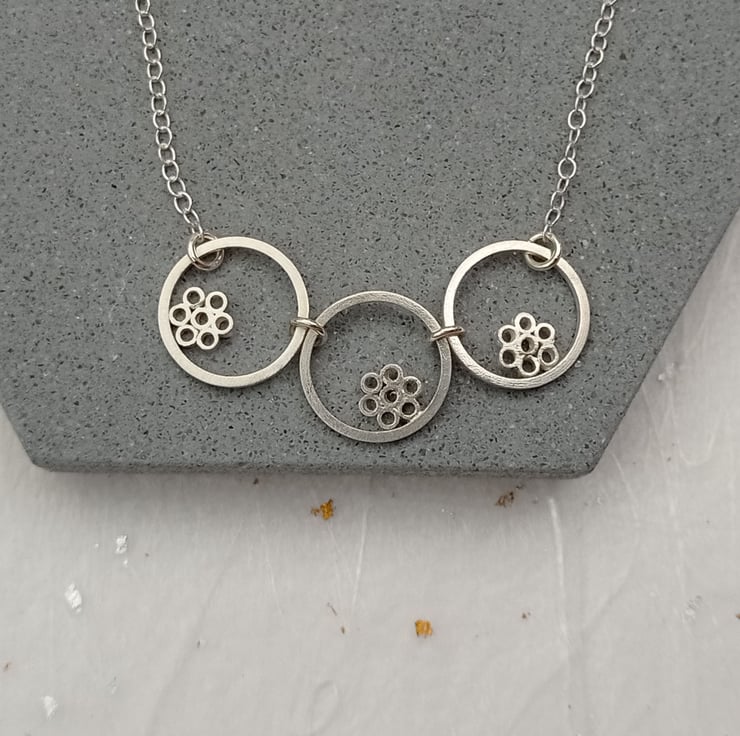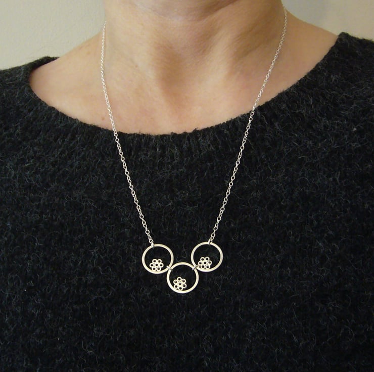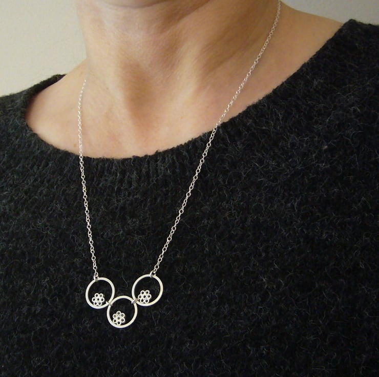 I have created this necklace by using recycled sterling silver square wire and tube. The tiny tubes have been soldered together to create flower shapes, soldered inside the wire circles, then given a brushed wire finish. The pieces have been joined together and attached to sterling silver chain. The necklace is part of a small collection of similar necklaces and earrings.