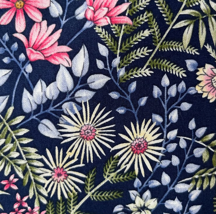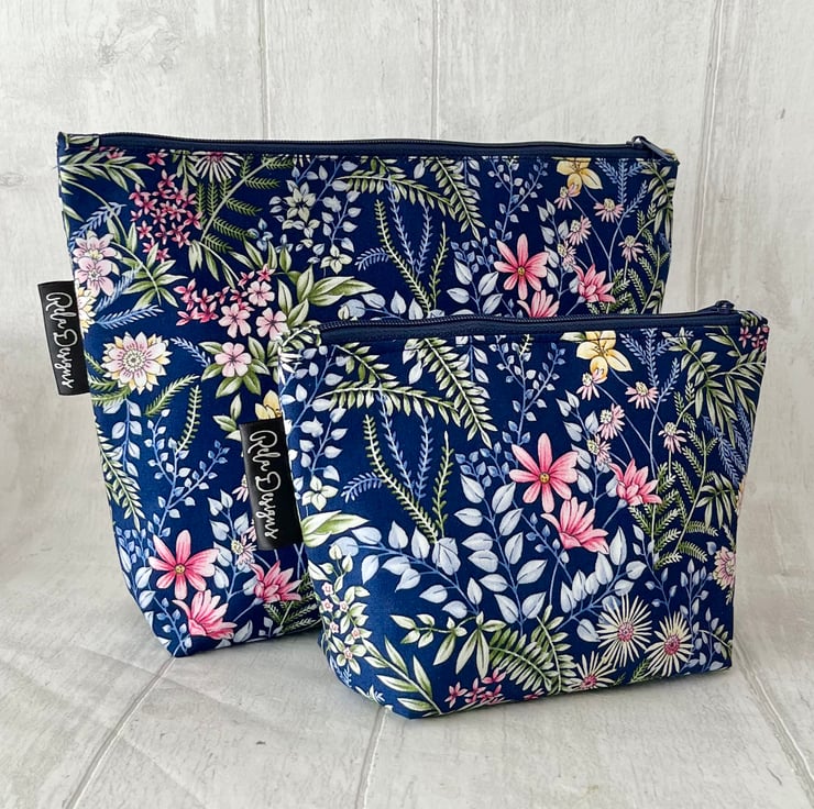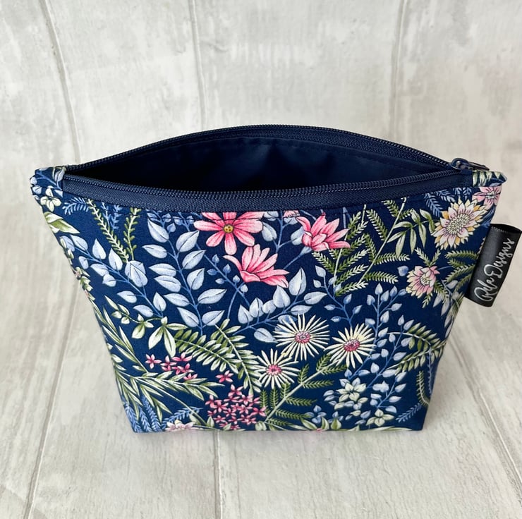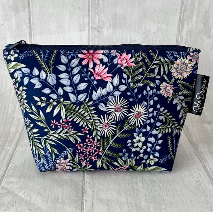 This beautiful tulip print cotton zipped pouch has a dark blue waterproof nylon lining , great for those inevitable spills.