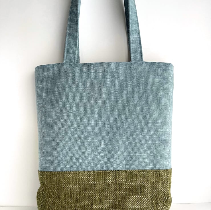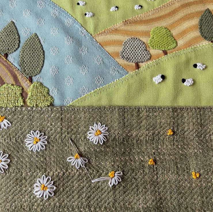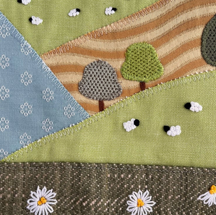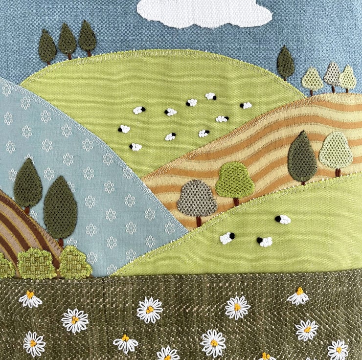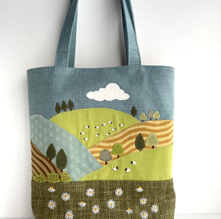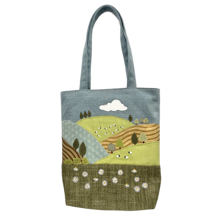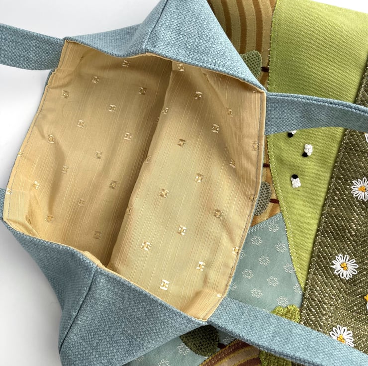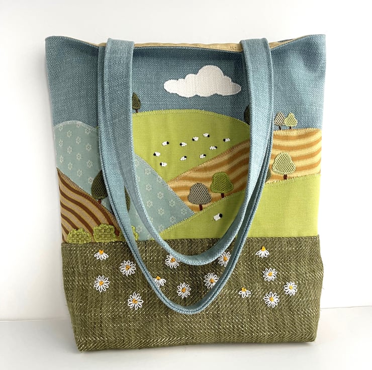 English countryside tote bag. This delightful bag has an appliqué and hand-embroidered design depicting a scene of fields and hills in summer. The lower part of the bag is made from green tweed fabric and the upper part from blue upholstery fabric. The green lower front is the foreground of the scene and depicts a meadow scattered with hand-embroidered daisies. Behind this meadow is an appliqué series of fields on hills. These are made from a variety of fabrics in shades of green, duck-egg blue, gold, beige and brown. Two of the fabrics have a wavy striped pattern and resemble ploughed fields. I've added numerous little appliqué trees and shrubs in various shades of green. To two of the fields I’ve added tiny sheep, made from hand-embroidered French knots. The blue upper front depicts the sky, to which I've added an appliqué cloud. The bag is lined with golden cream fabric with a woven pattern of small shiny squares.