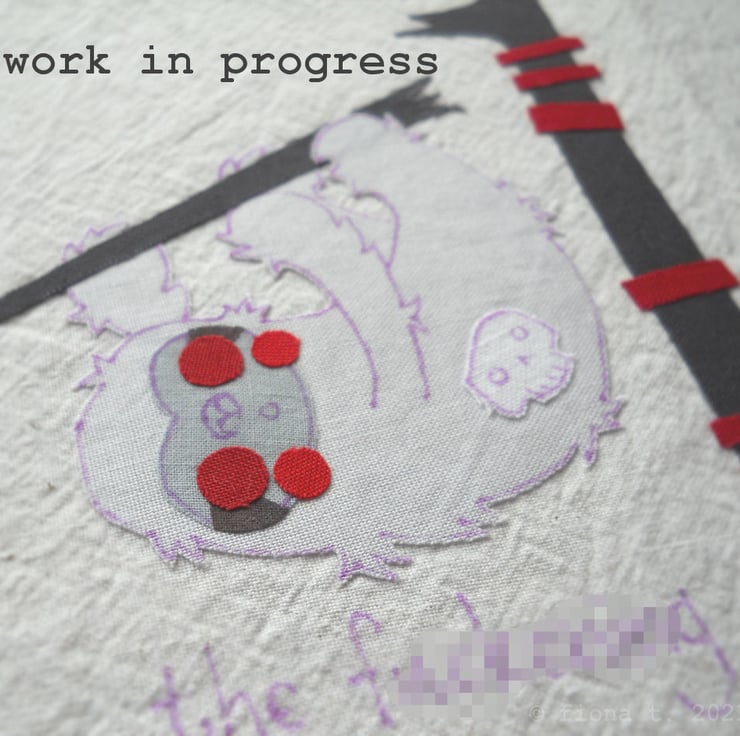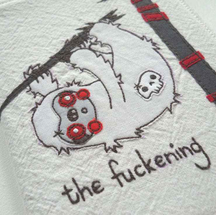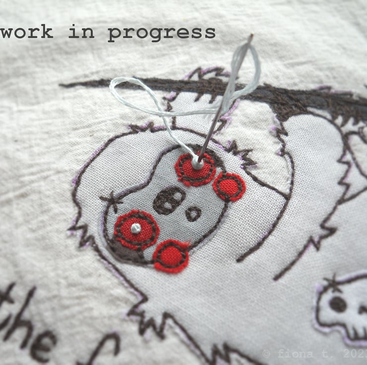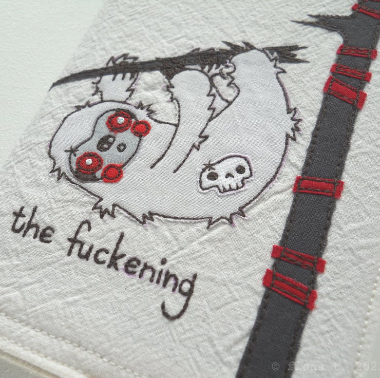 zombie sloth comes crashing down. he’s cut from pale grey cotton and hand dyed corpse grey lawn, and has a white skull on his bottom. each piece of fabric is hand-cut, and then (very patiently!) layered & appliqued onto cotton calico to build up the image, before “drawing” the intricate details on freehand, using free motion embroidery.