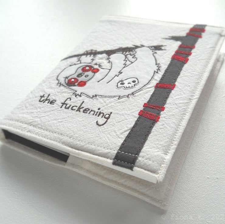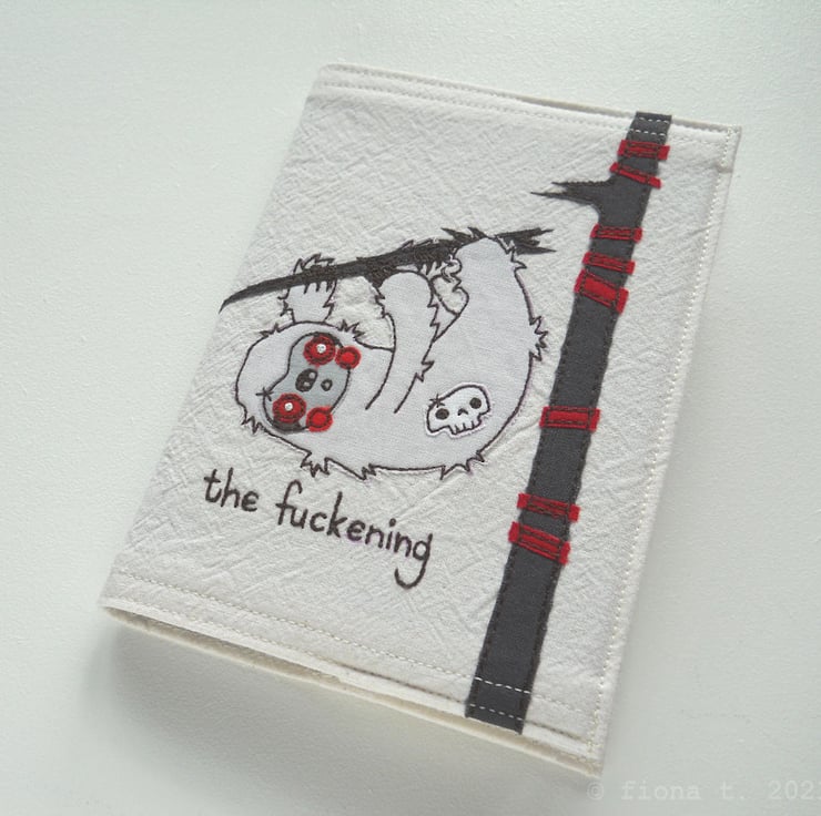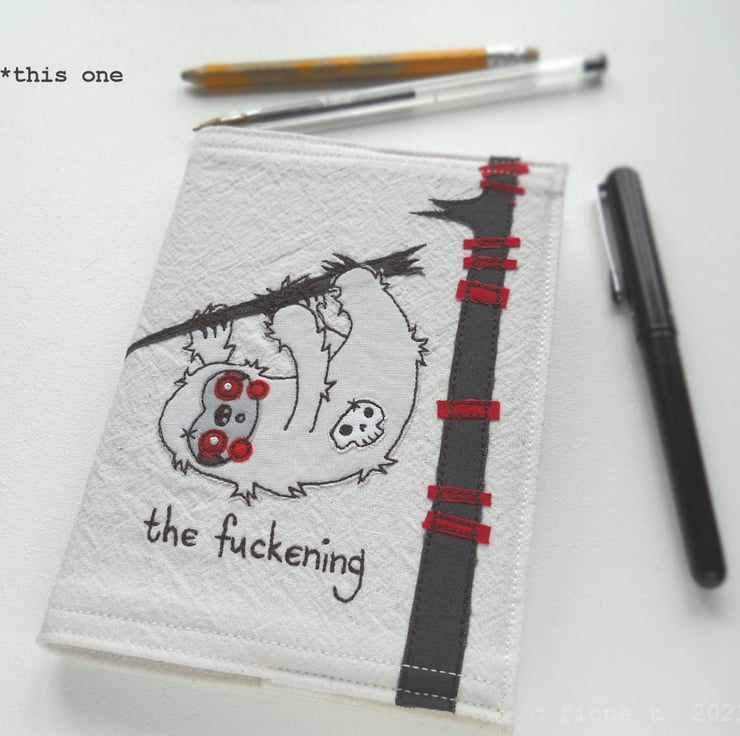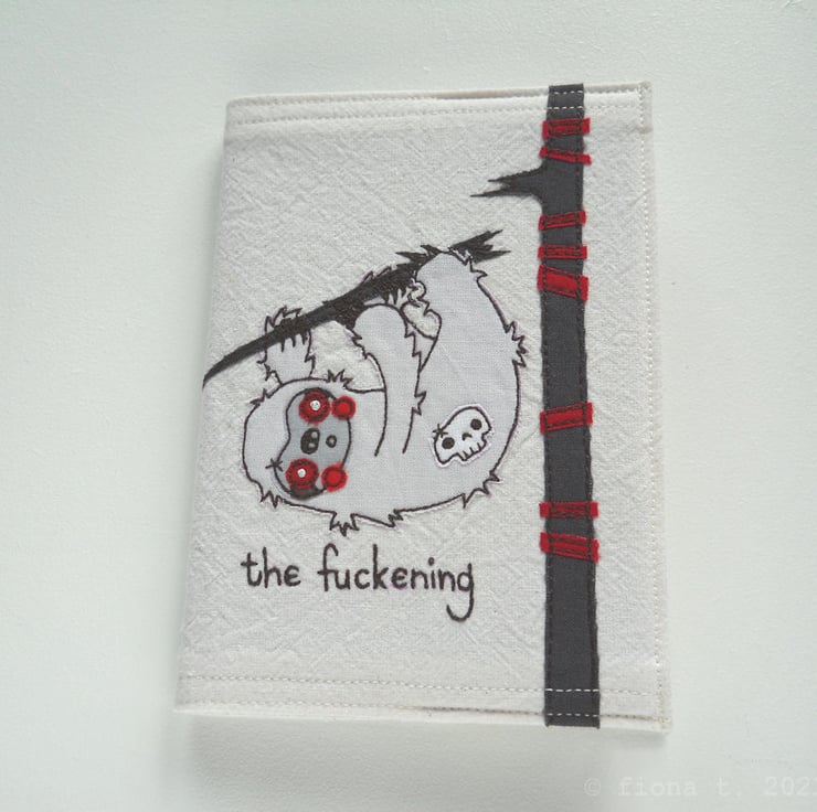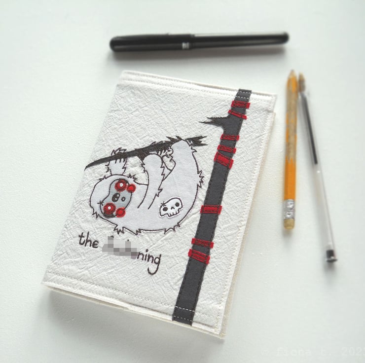 applique & freehand embroidered zombie sloth notebook cover with A6 sketchbook inside.