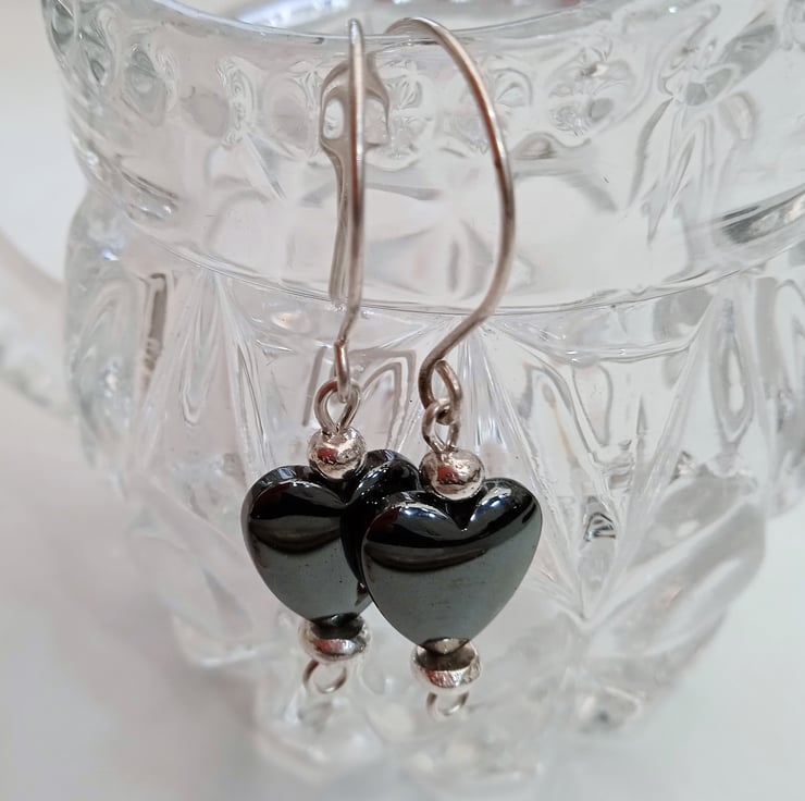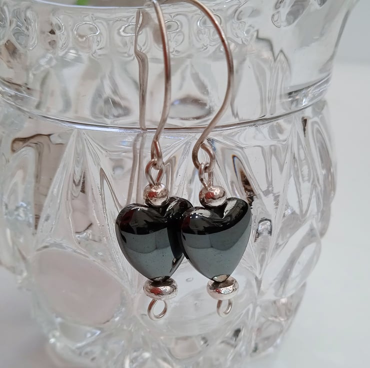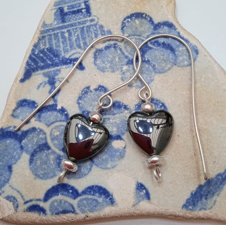 I have created these attractive earrings from 12 mm hematite heart beads and solid sterling silver beads which I have handmade from molten sterling silver. As the sterling silver beads are handmade they have a rustic charm and have an irregular shape and texture.