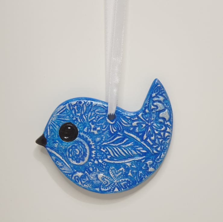 Cute blue and white clay bird which has been lovingly made from air dry clay. The front and back of each bird has been decoratively textured and painted with acrylics and then varnished . This sweet bird is supplied ready to hang with white satin ribbon and as both sides have been decorated it looks great when hung in a window. Supplied in a pretty organza bag finished with ribbon this little clay bird would make a lovely gift.