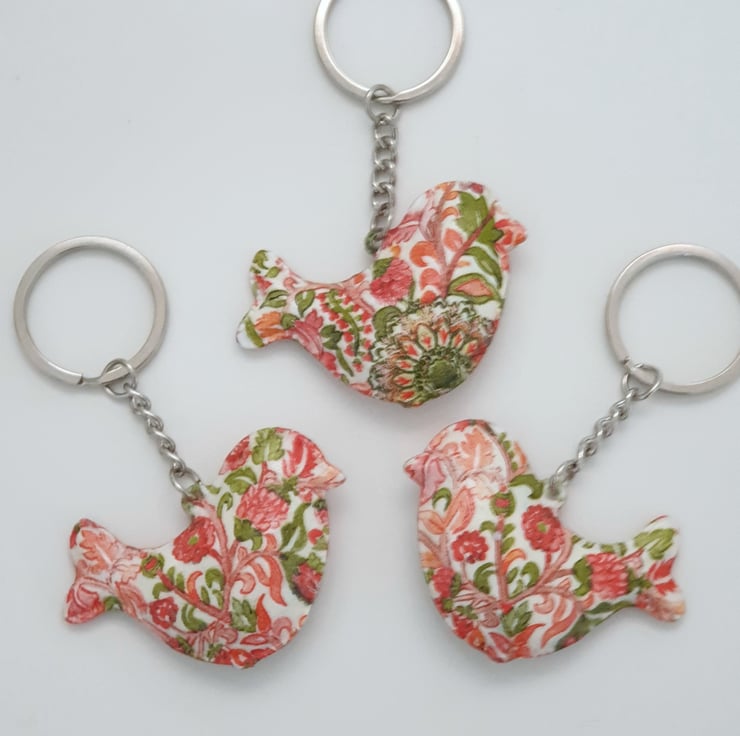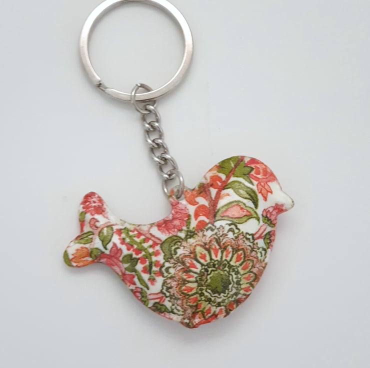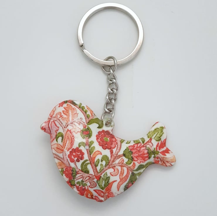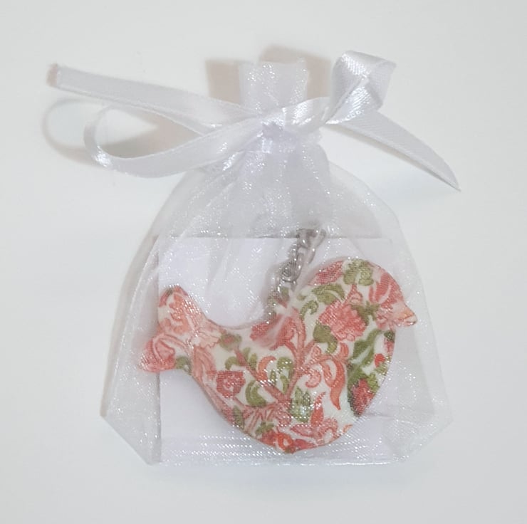 This bird shaped keyring is made of metal and has been painted white and decoupaged with a pretty floral pattern in green and red. The pattern is different on each side. The keyring has then been finished with varnish. This decorative keyring will arrive packaged in an organza bag finished with ribbon and would make a lovely gift for a bird lover.