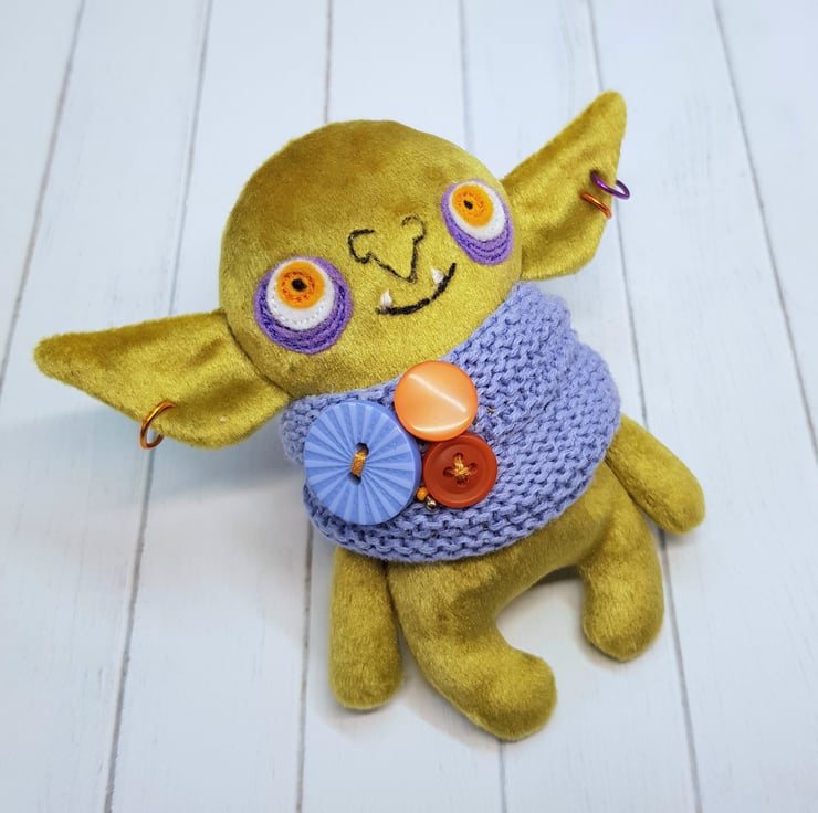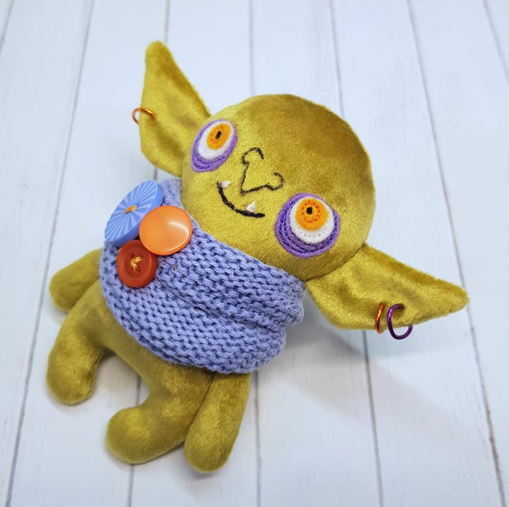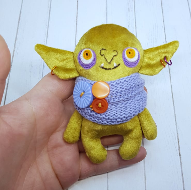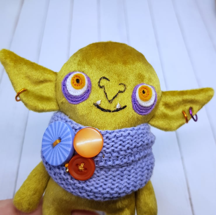 Velvety curry green goblin art doll with upcycled cotton scarf. This goblin has free motion embroidered felt eyes and measures roughly 11cm tall with an 11cm earspan. The goblin is firmly stuffed and the scarf features mismatched buttons. This goblin is designed and created by myself. This goblin is not a toy and meant for decorative purposes only. Sent in recyclable packaging.