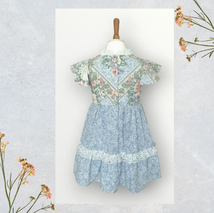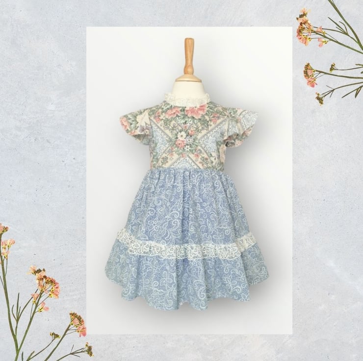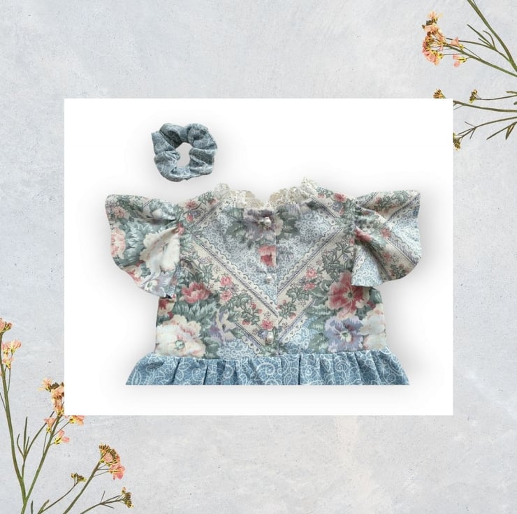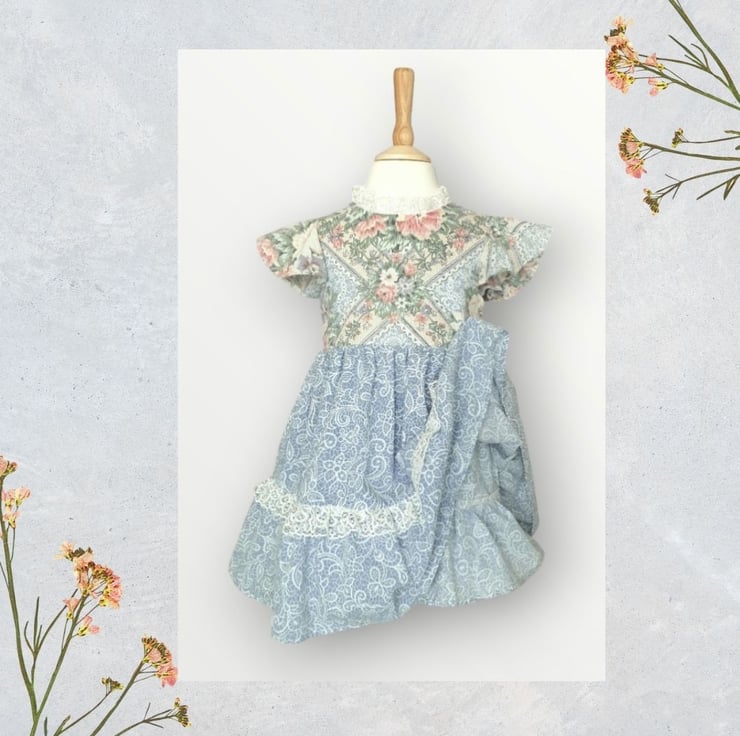 Quite traditional rose print with matching paisley sister print. I deal for Sunday best or a Saturday lunchtime maybe. She has a lace frill around the neck and over the hem frill, and has cute gathered angel sleeves with pearl effect buttons at the back. As always she's fully lined and comes with matching scrunchie and free organza bag.