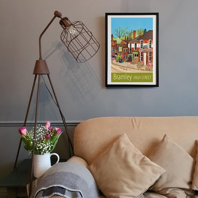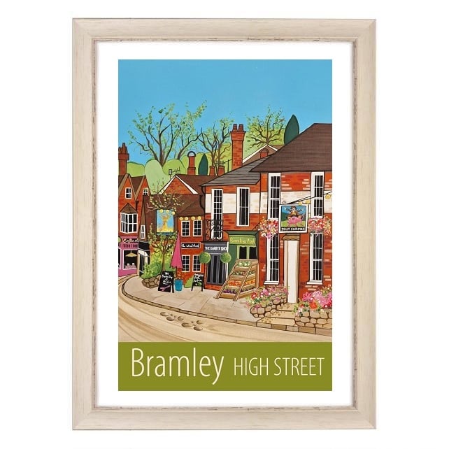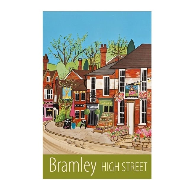 A contemporary travel poster style print of the lovely High Street in Bramley, Surrey, from my own original acrylic painting.