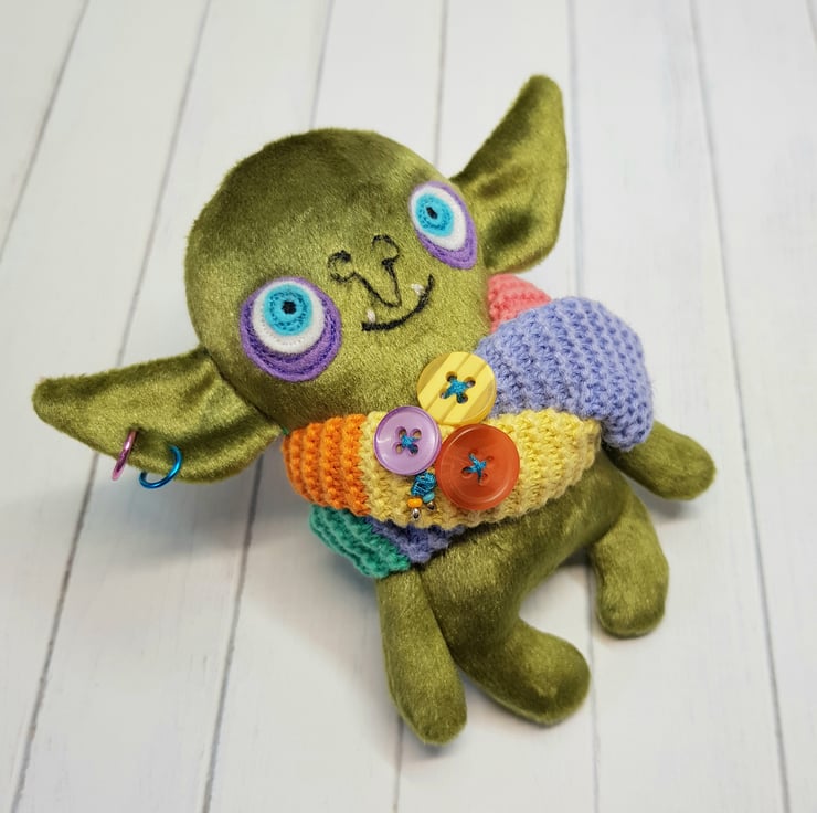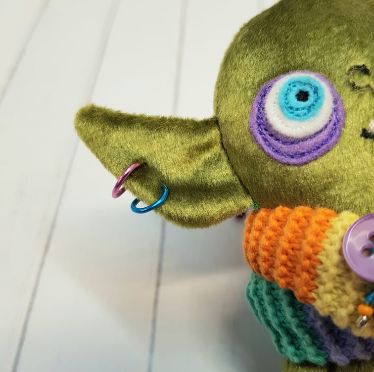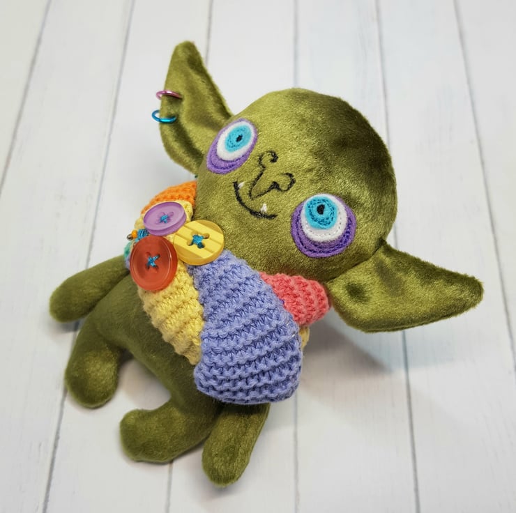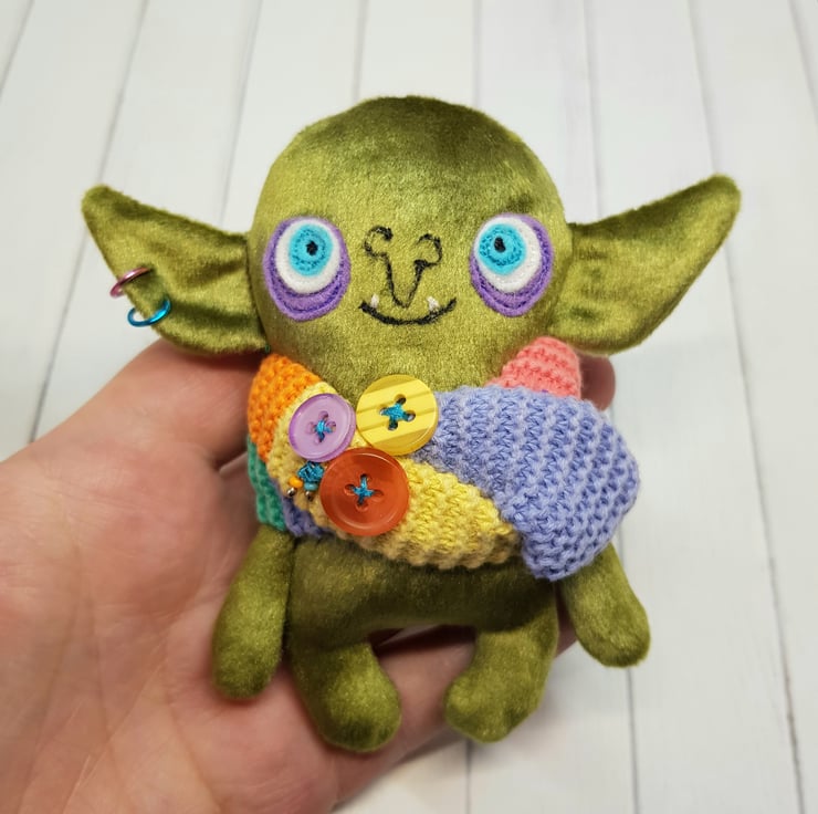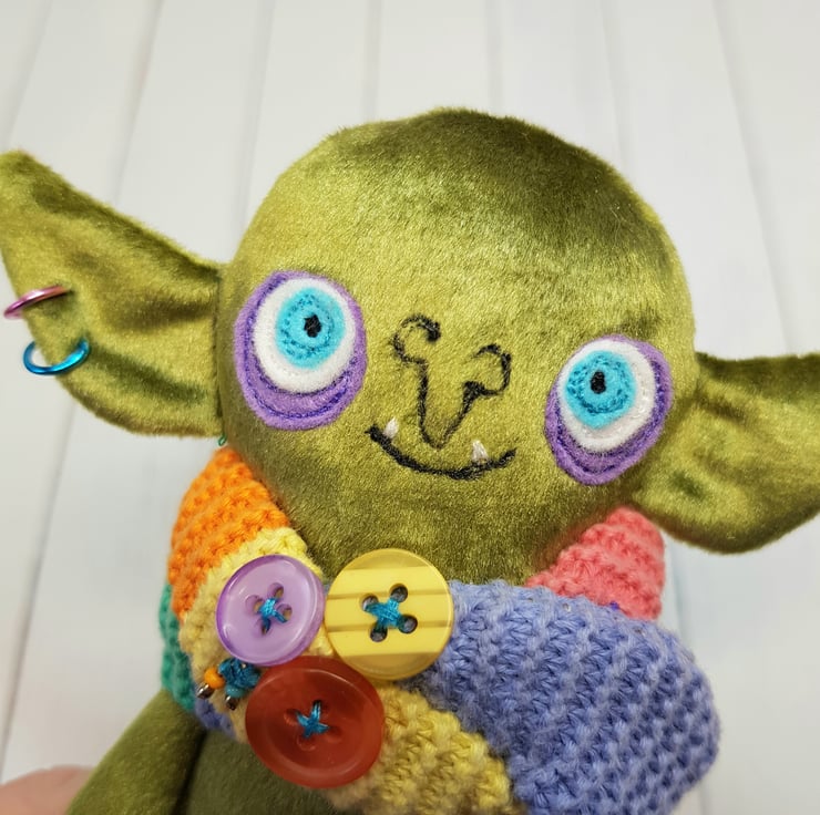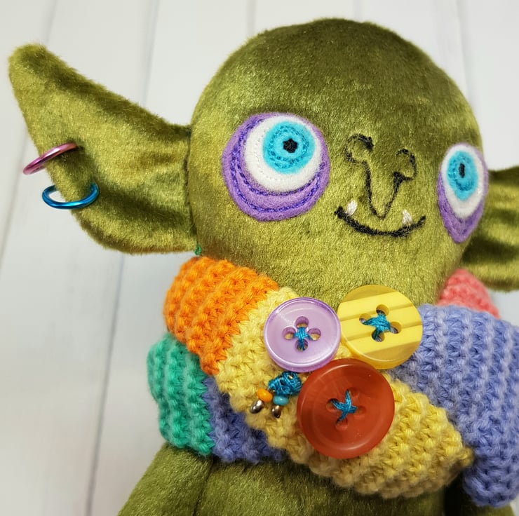 Velvety green goblin art doll with upcycled cotton scarf. This goblin has free motion embroidered felt eyes and measures roughly 11cm tall with an 11cm earspan. The goblin is firmly stuffed and the scarf features mismatched buttons. This goblin is designed and created by myself. This goblin is not a toy and meant for decorative purposes only. Sent in recyclable packaging.