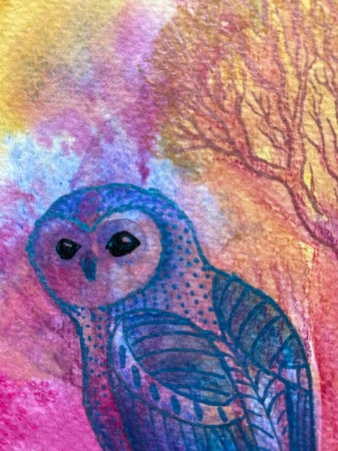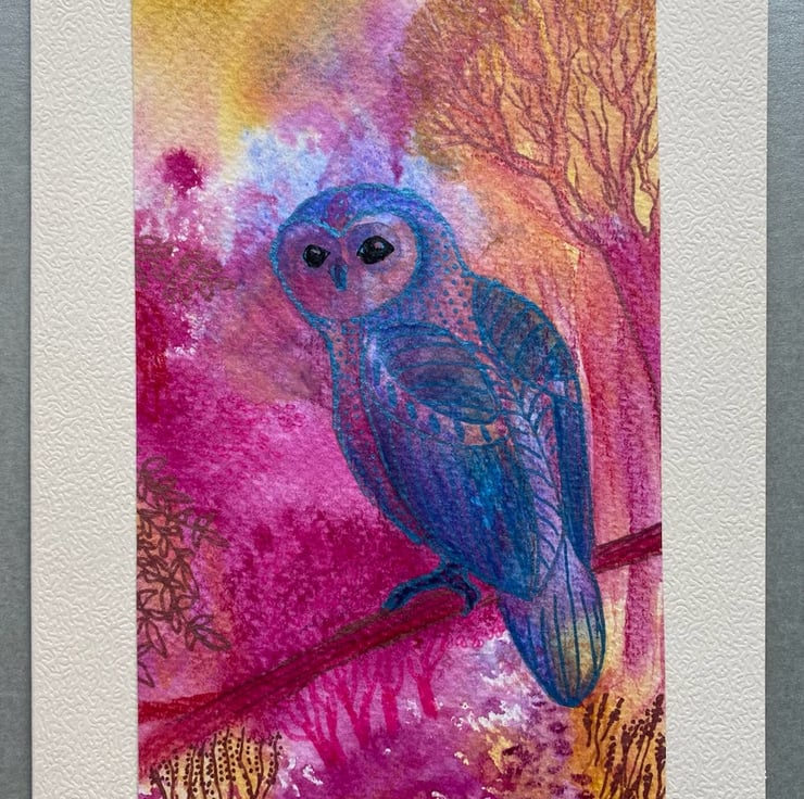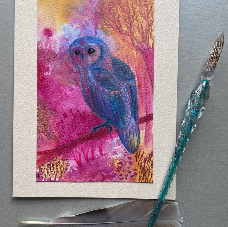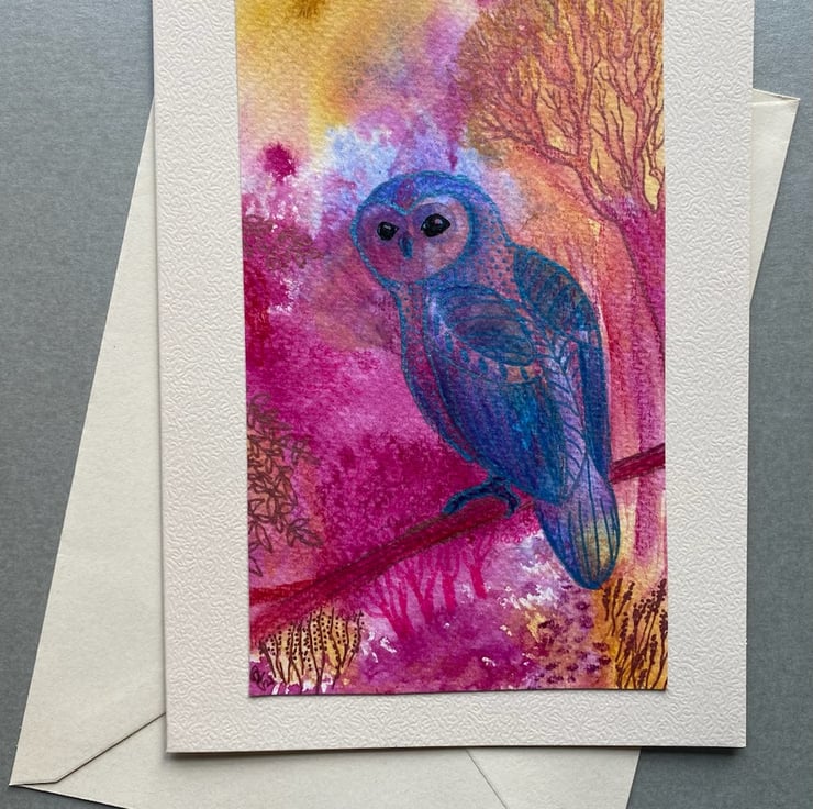 Hand painted in mixed media on watercolour paper adhered to quality card stock, this cute owl is a colourful greetings card, which is blank inside for you to write your own message. It measures approx 15 x 10 cms and comes with an envelope and sealed in a cello bag. Postage is free to UK destinations.
