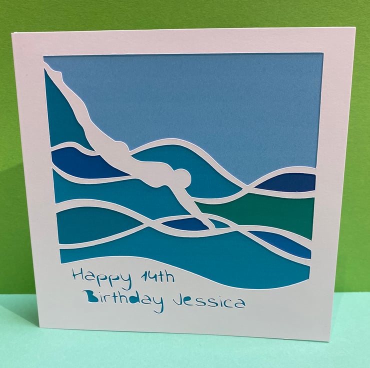 This elegant card features a paper cut swimmer diving into beautiful shades of blue wavy water. There is a personalised message at the bottom, which can say whatever you would like it to say, or it can be left blank.