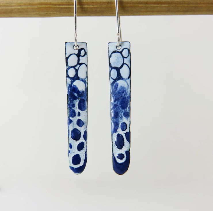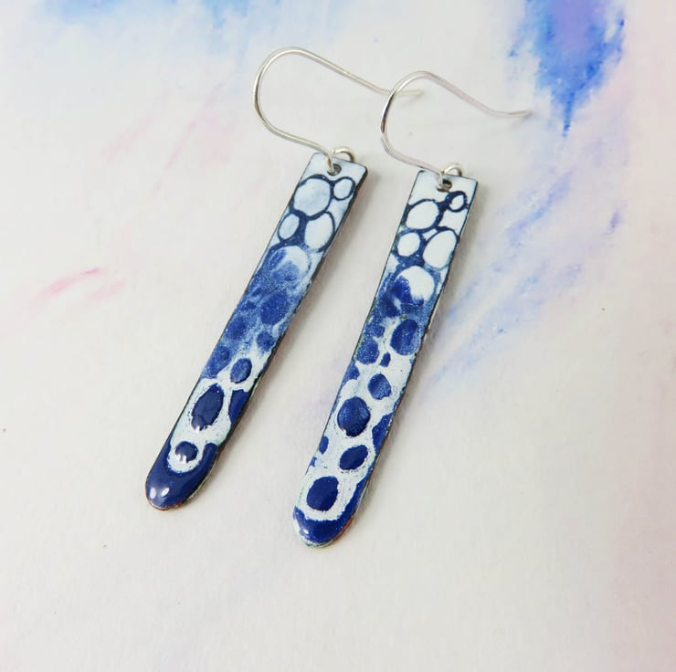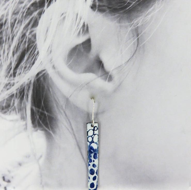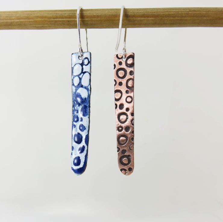 Copper rectangles have been textured on the back with a circle stamp. On the front I used dark blue and white enamel. I fired them in the kiln to melt the enamel. I then applied white enamel and before firing it I drew through it create the pebble pattern. I polished the backs to reveal the copper. They hang on silver ear wires. Posted out to you in a gift box with information about the enamelling process. A unique one off pair of earrings.