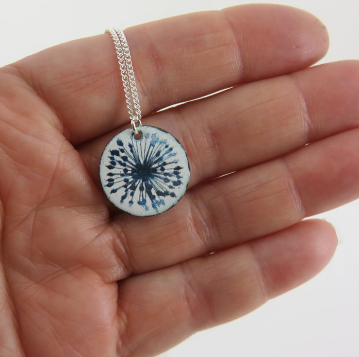 18mm wide copper disc has been enamelled with white enamel. A blue and turquoise allium flower has been fired into the surface. It hangs on a silver plated curb chain.