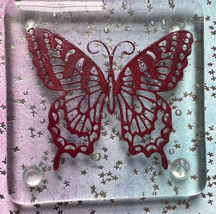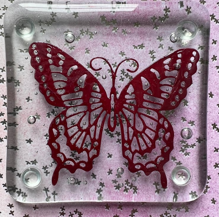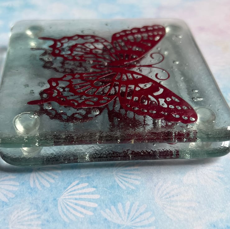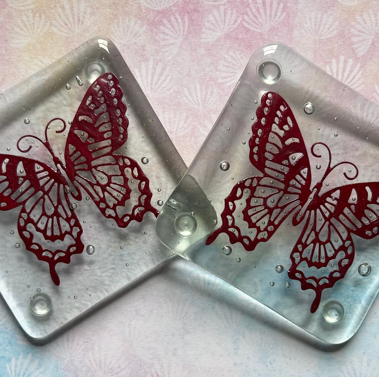 A pair of pretty fused glass coasters with copper foil filigree butterflies captured forever inside. A perfect gift or a lovely addition to your home. Each measures approximately 9cm x 9cm and has a bumper at each corner to protect furniture. Postage and packing are included in the price.