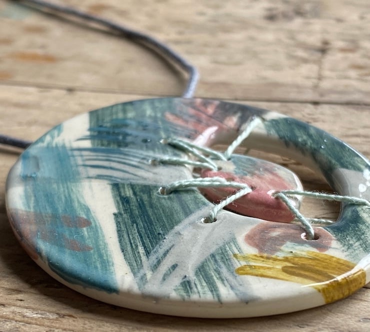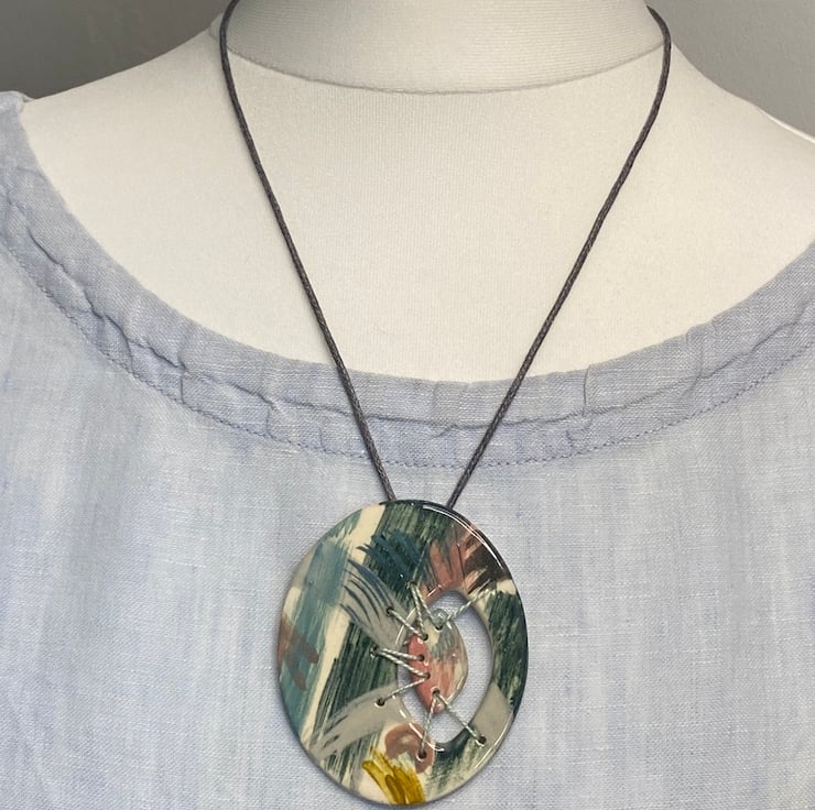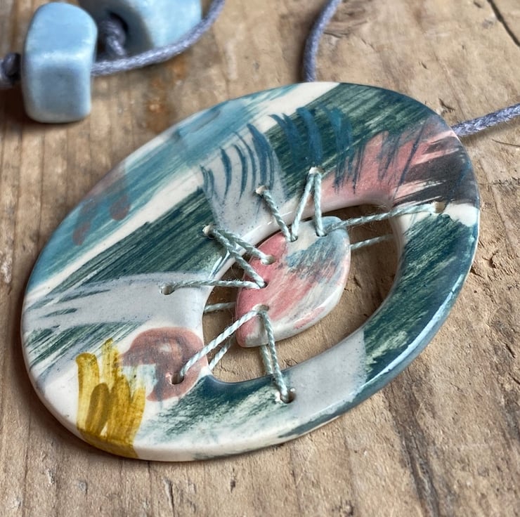 Decorated with a fabulous palette of Teals, Ochre, Pink, Greens and Grey. A Fragment of Ceramic has been stitched to the pendant using beautiful French Grey embroidery thread, creating a truly unique piece of Artisan jewellery.