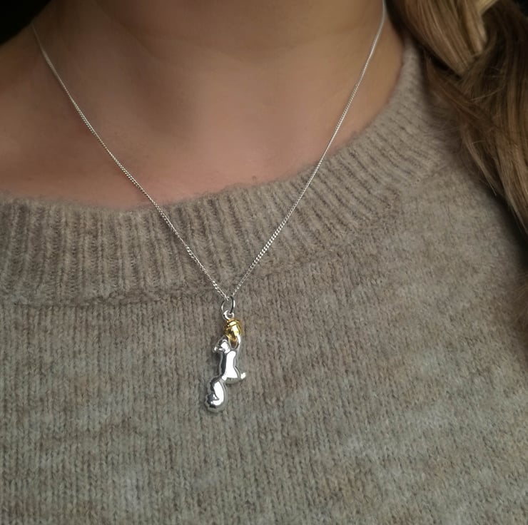 A super cute squirrel holding an acorn, crafted in sterling silver with a gold plated acorn. This pendant is suitable for both ladies and children and makes a great gift for nature lovers.