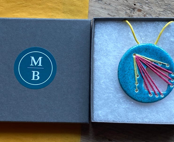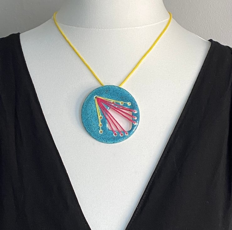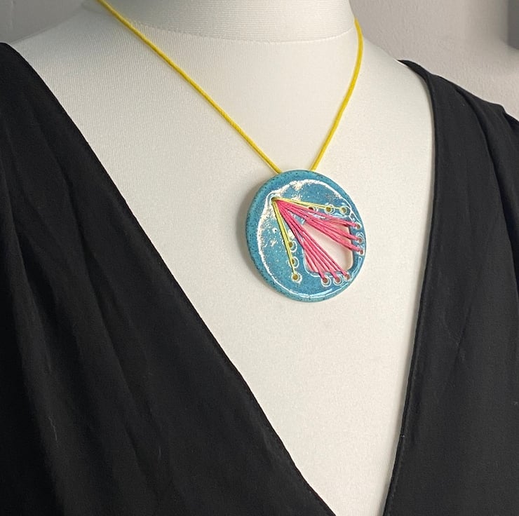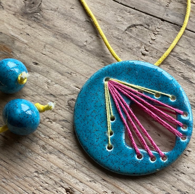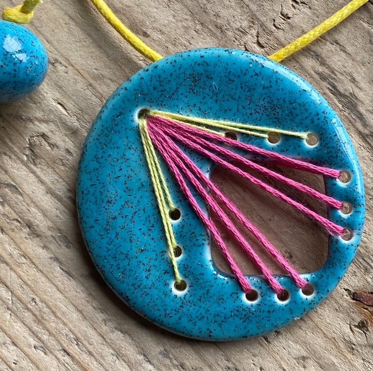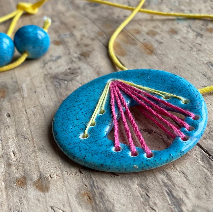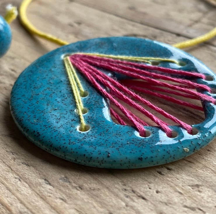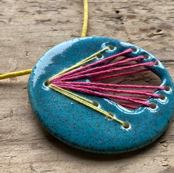 Glazed in a sumptuous Hawaiian Blue and stitched using Pink and Lemon embroidery threads, creating a truly unique piece of Artisan jewellery.