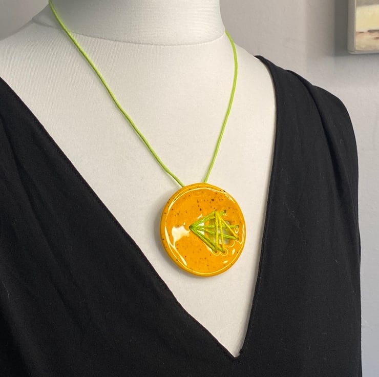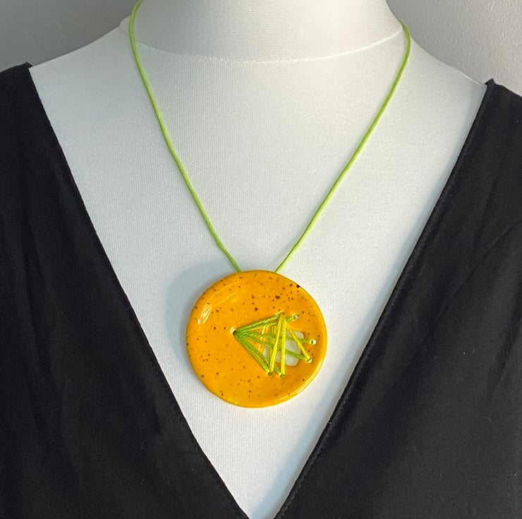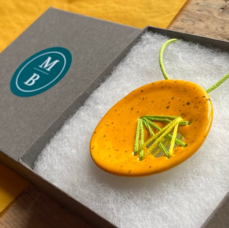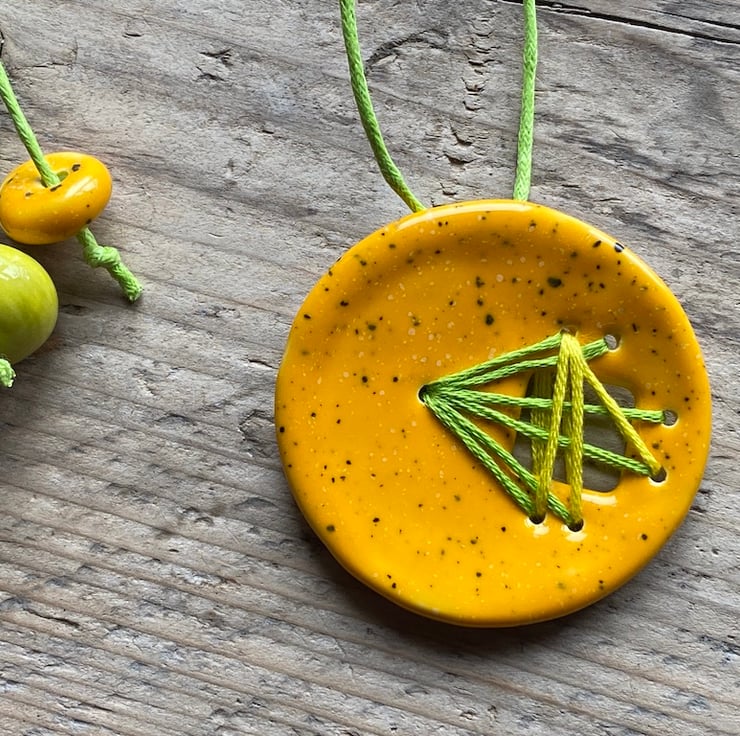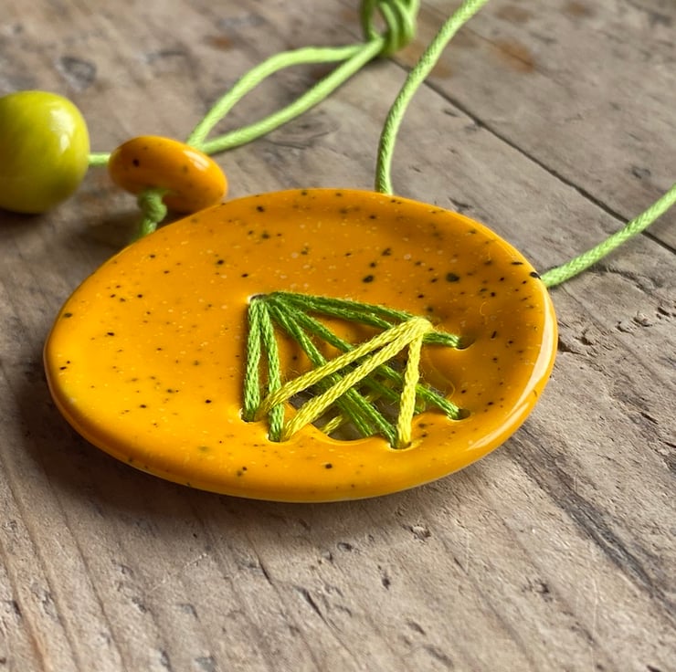 Glazed in a sumptuous Speckled Yolky Yellow and stitched using Lime Green and Yellow embroidery threads, creating a truly unique piece of Artisan jewellery.