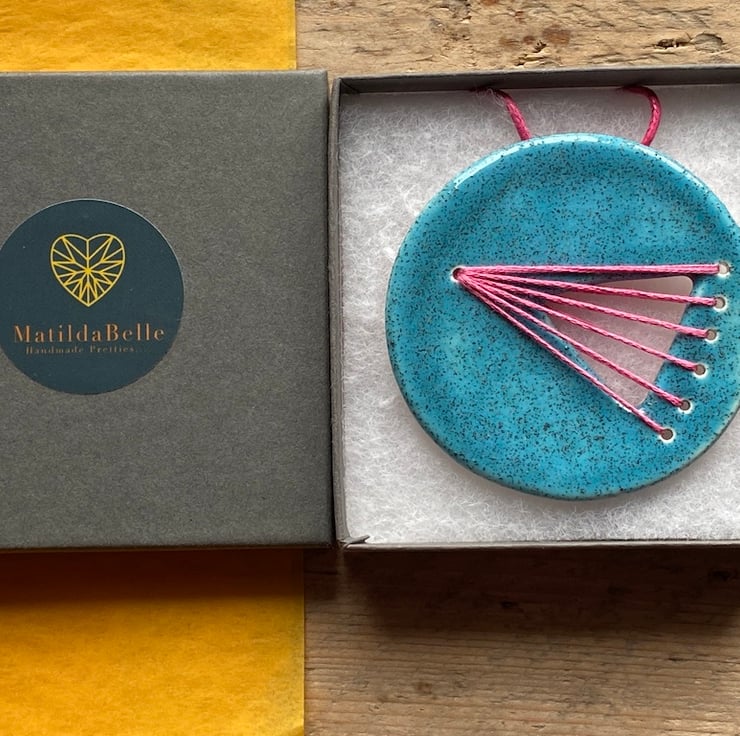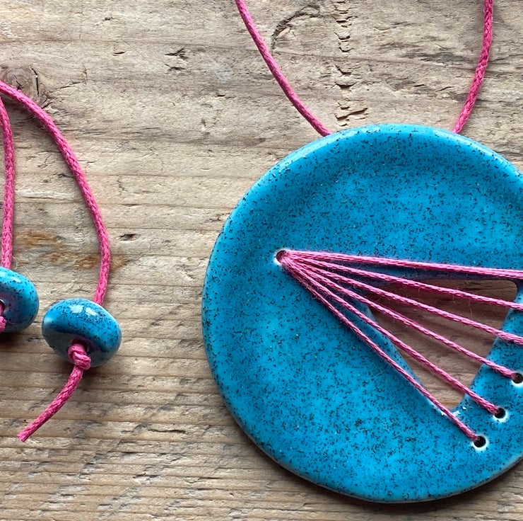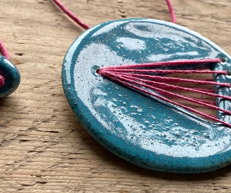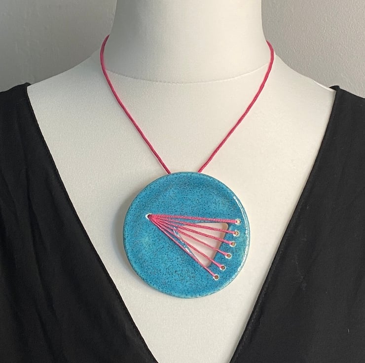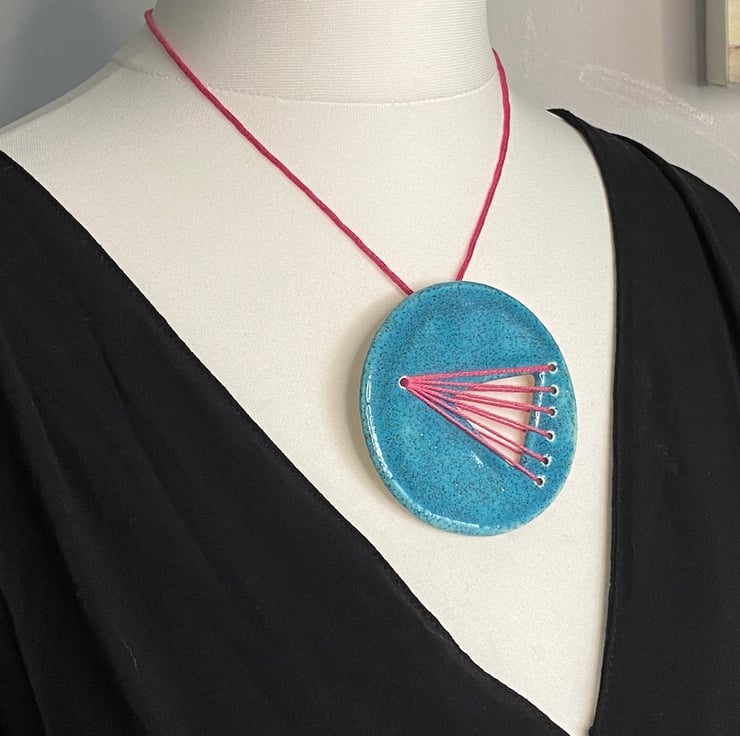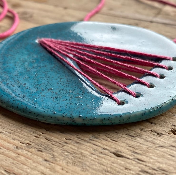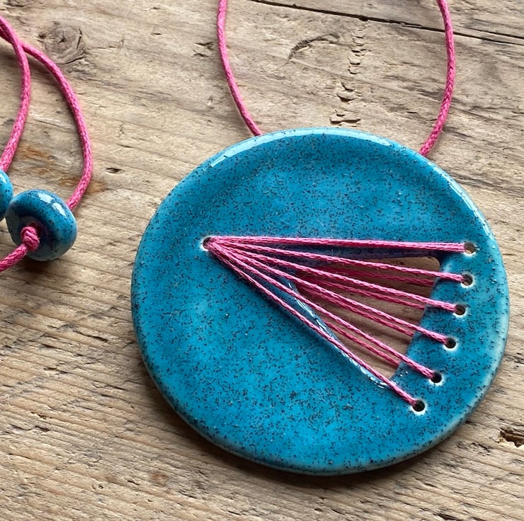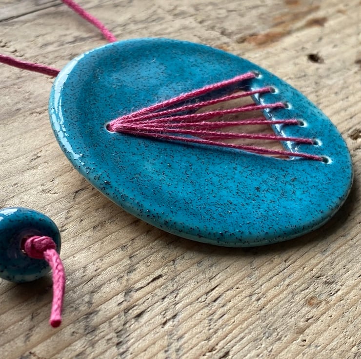 Glazed in a sumptuous Hawaiian Blue and stitched using Hot Pink embroidery thread, creating a truly unique piece of Artisan jewellery.