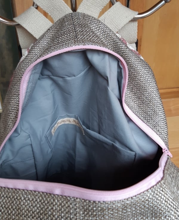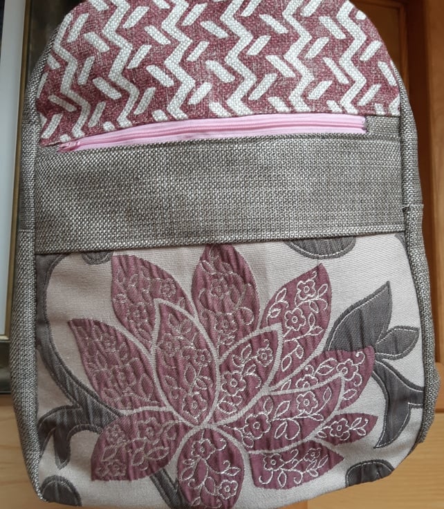 Lightweight backpack in shades of pink and fawn. Zipped front pocket, zipped main compartment, lined in grey cotton with inner pocket. Adjustable cotton webbing straps.