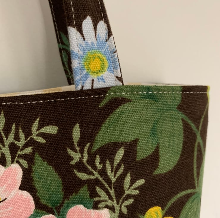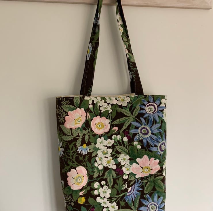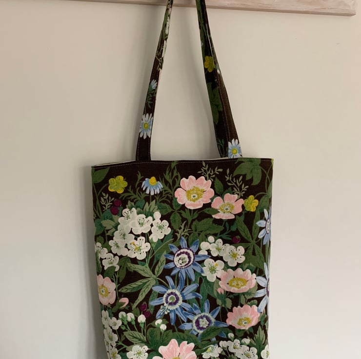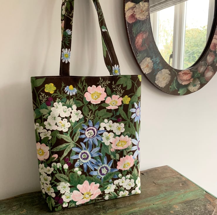 Pretty tote bag made from reclaimed vintage floral linen union, Belinda by Jonelle. It’s a beautiful mix of passion flowers, dog roses and other flowers on a dark brown background.