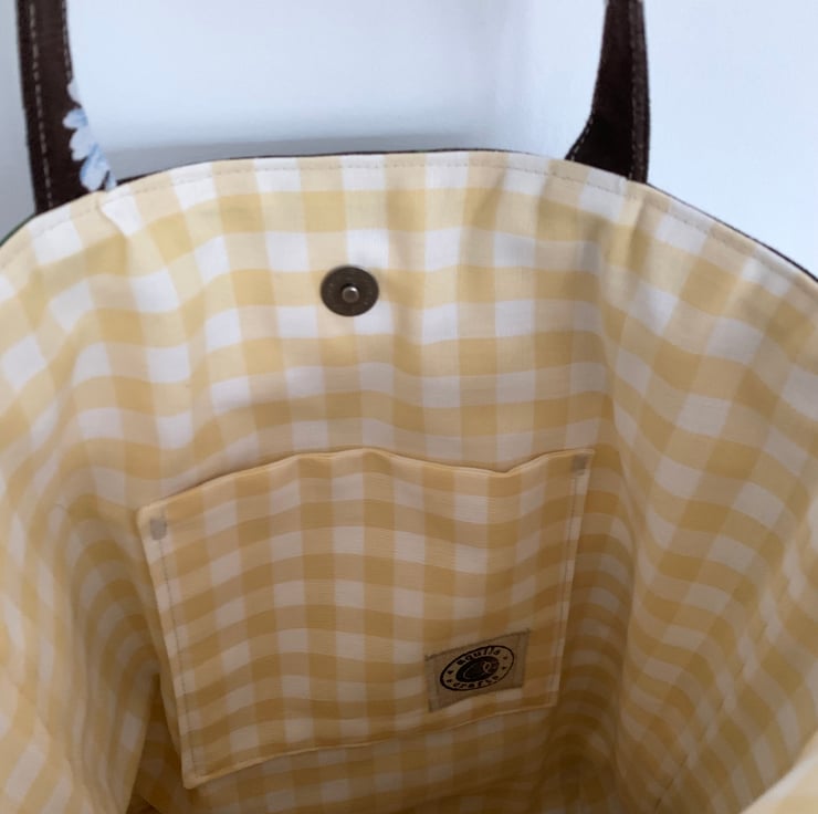 The bag is lined with pale yellow gingham. A layer of interfacing gives the bag some structure.