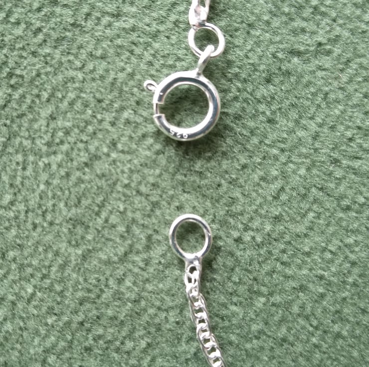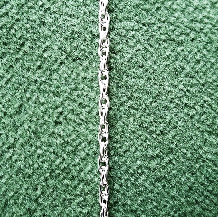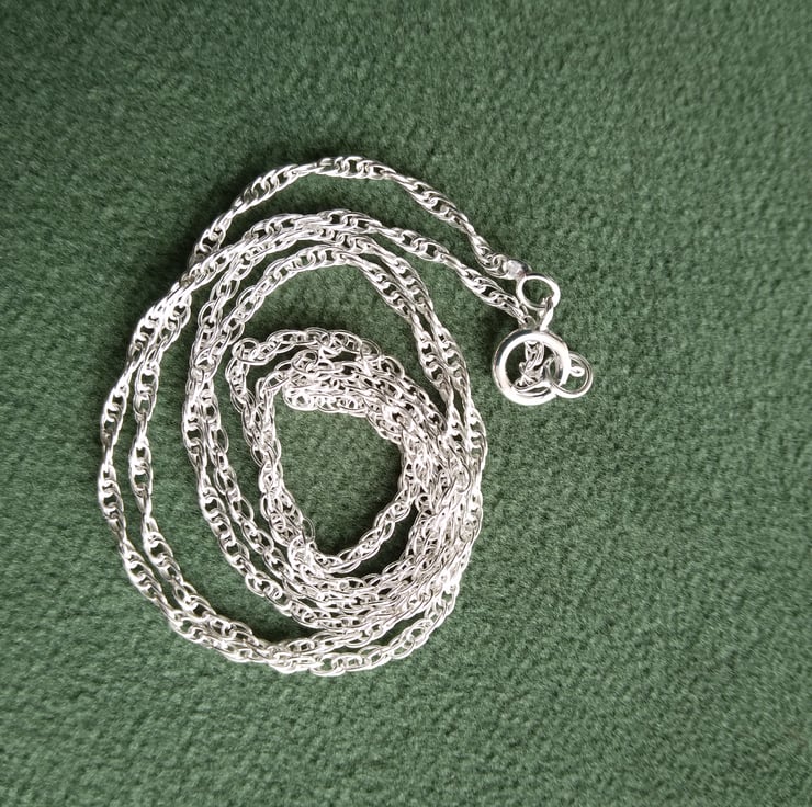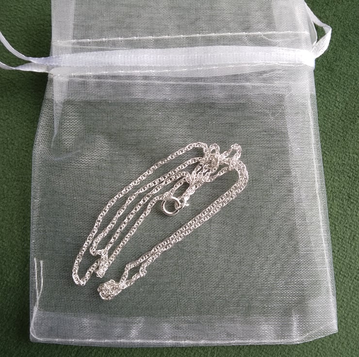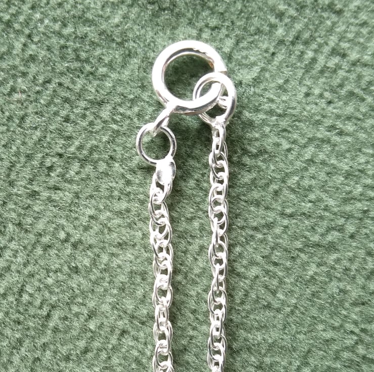 An 18" sterling silver rope chain made from recycled silver and with a thickness of 1.5mm. The chain is fastened with a bolt ring and the jump ring on the opposite end from this is just under 4mm in diameter, so will fit any of the pendants sold in my shop. It has been chosen to complement my pendants, but a custom length cord is also available (please see separate listing). It is pictured with the organza bag that comes with each pendant.
