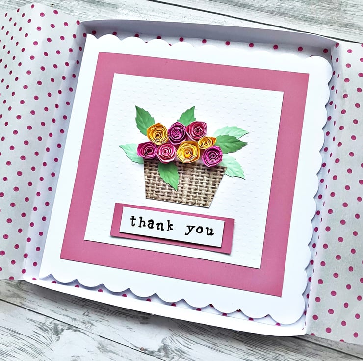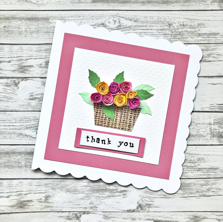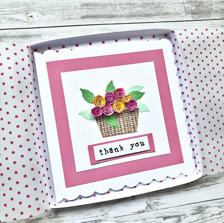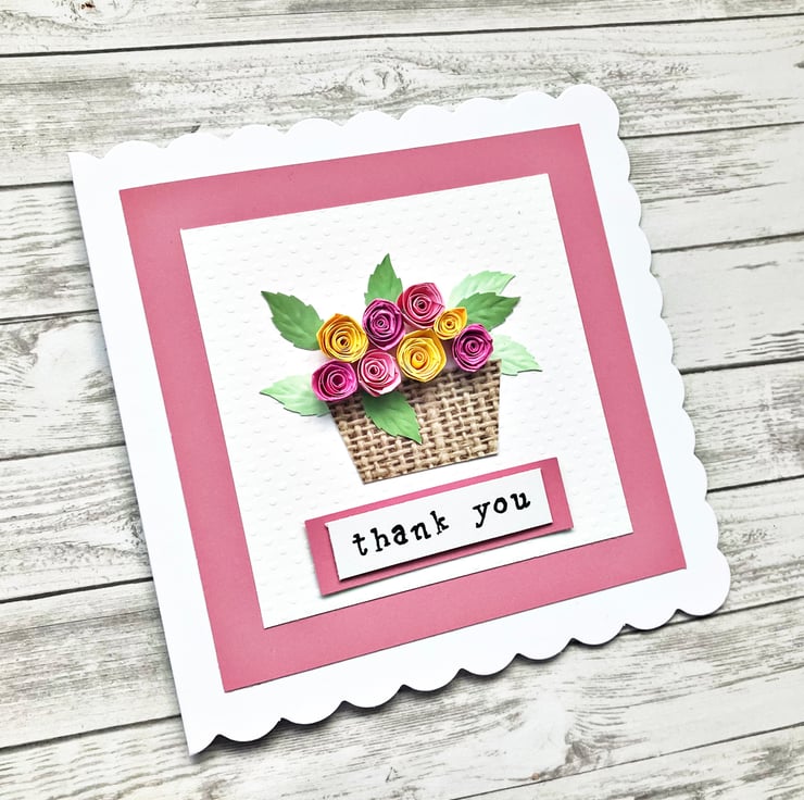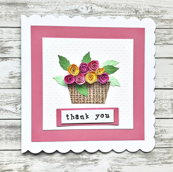 This unique card features a basket of pink and yellow quilled roses with embossed leaves in different shades of green. The basket is on an off-white dot textured card placed on a pink background and the words ‘thank you’ have been hand-stamped.