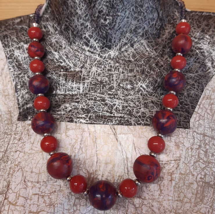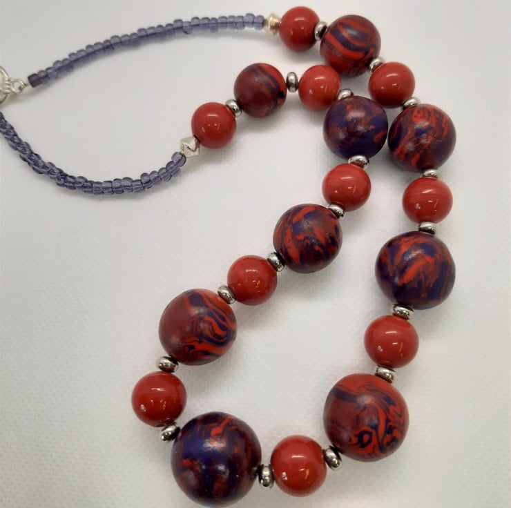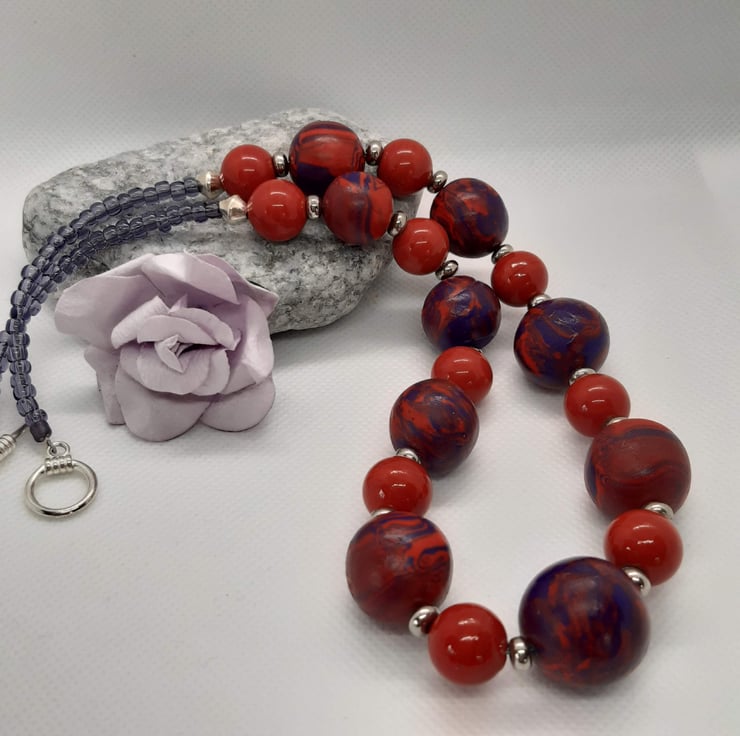 A colourful necklace featuring poppy red and purple polymer clay beads in a unique swirl design.