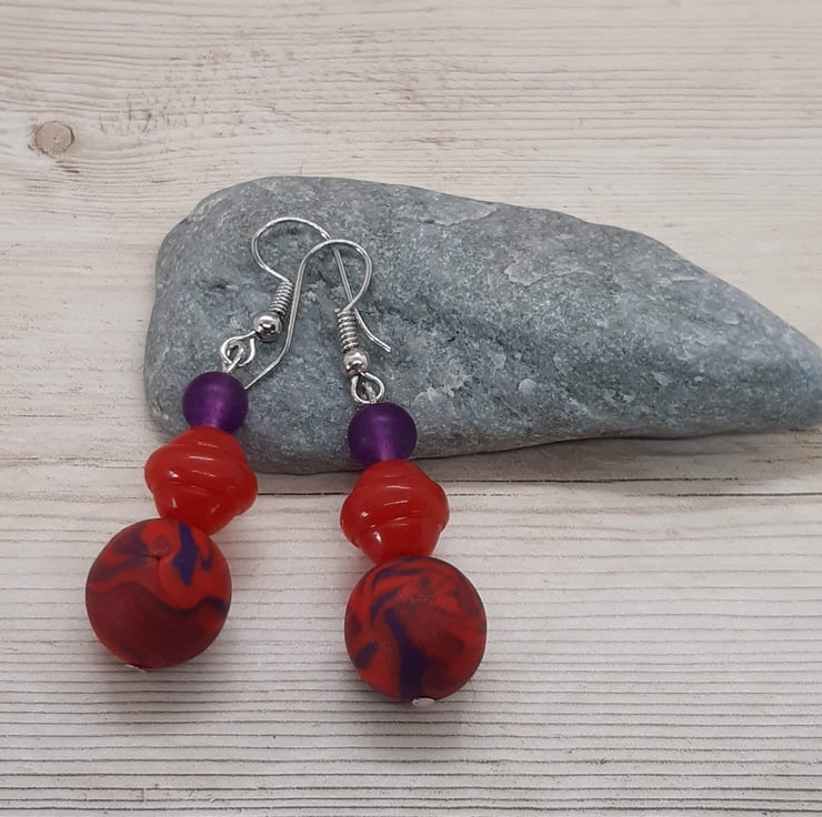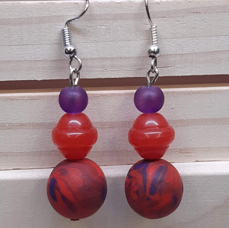 Dangly earrings in a poppy red and purple swirl design. The handmade polymer clay bead measures 13mm with a bright red ‘saturn’ bead and 6mm purple glass round bead to complete the look.
