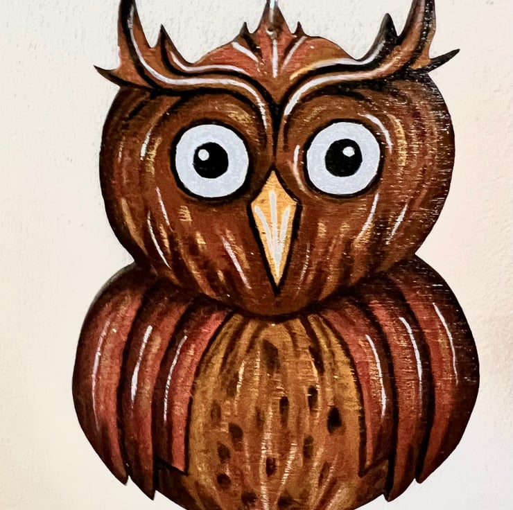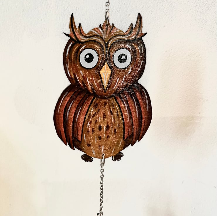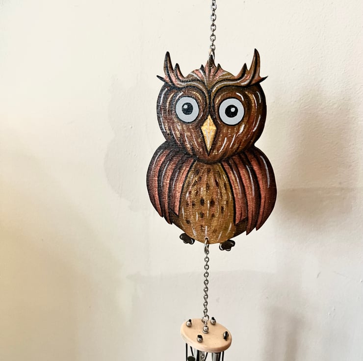 Hand painted wooden owl wind-chime with aluminum chimes for a gentle sound. Stainless steel hanging chain.