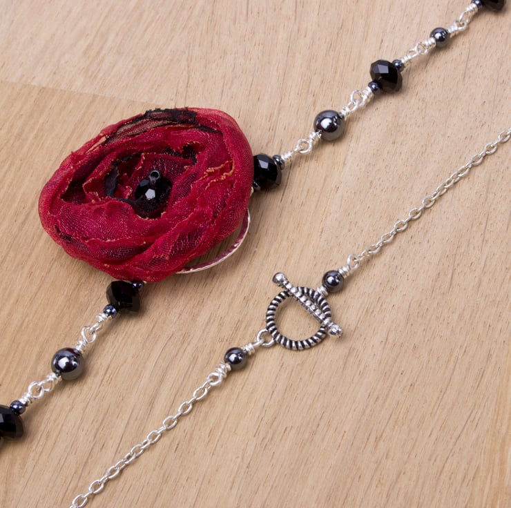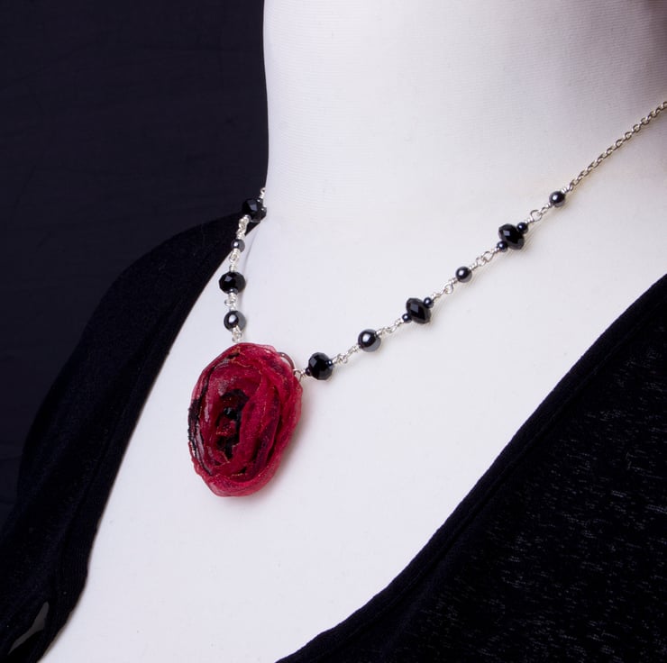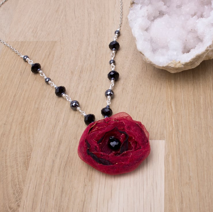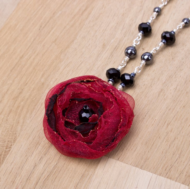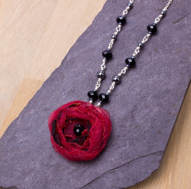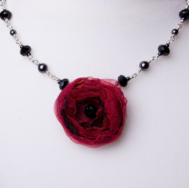 A gorgeous necklace featuring a handmade red and black organza flower as its centerpiece. The flower is complemented by wire wrapped hematite and black faceted glass rondelles, which are incorporated into a silver tone oval link chain. The necklace measures approximately 18 inches long and comes with a toggle clasp. This unique piece is handmade and ready to be shipped.