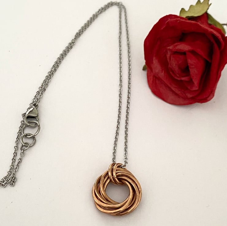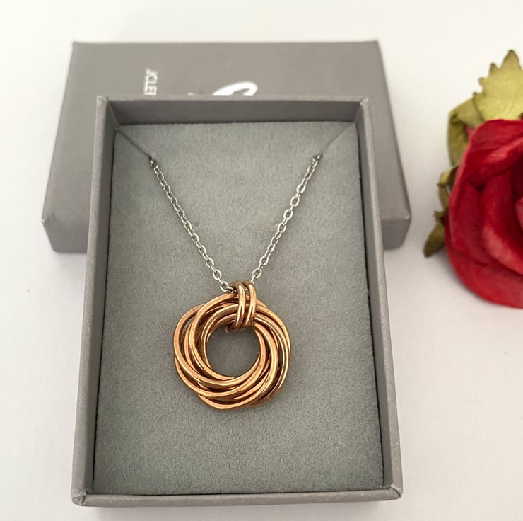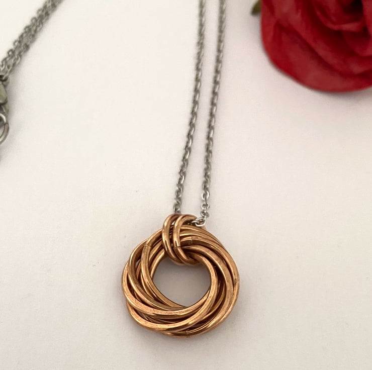 Handmade at approximately 2cm in height and diameter, this bronze pendant consists of eight rings to represent 8 years together. Each ring has been hammered into a rustic (slightly irregular) circle shape and interlocked (entwined) to give this lovely meaningful pendant. The mobius circles pendant is a lovely gift idea for him or her to celebrate an 8th wedding anniversary, or 8 years together.