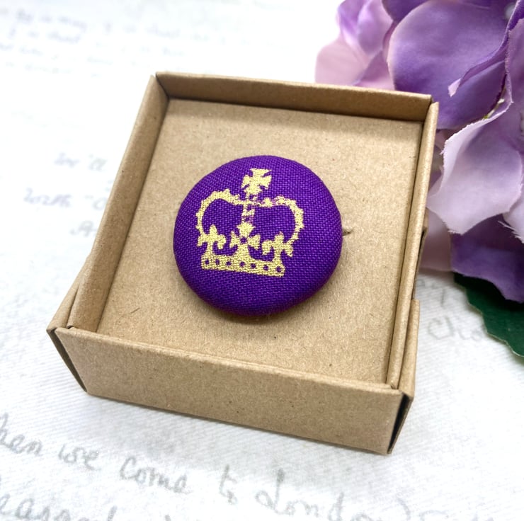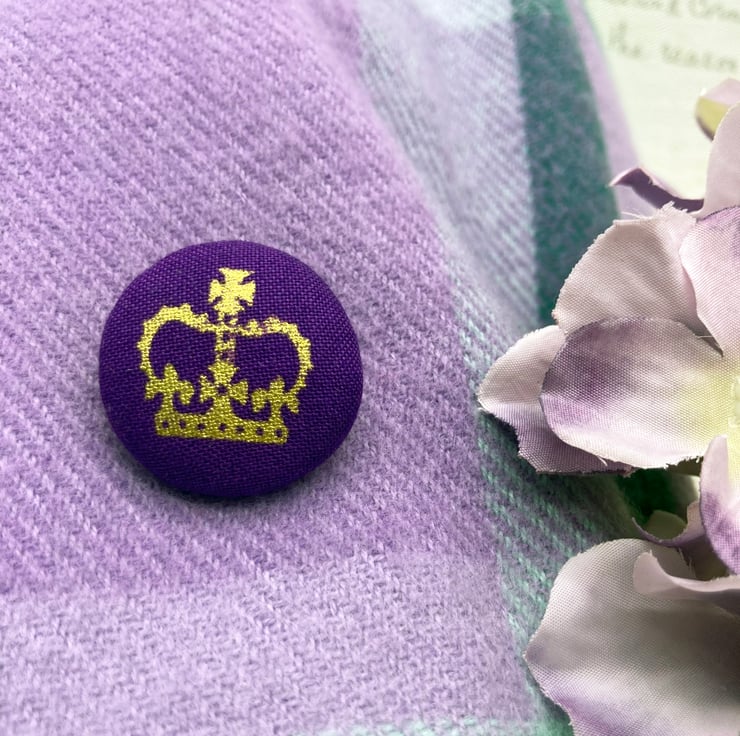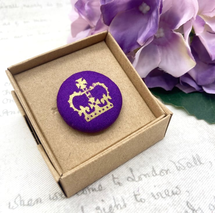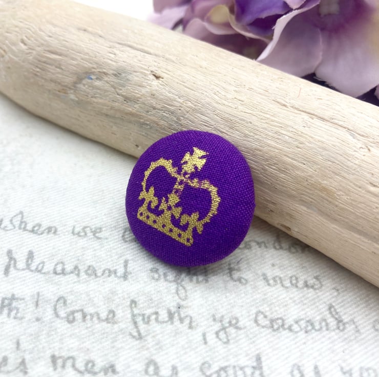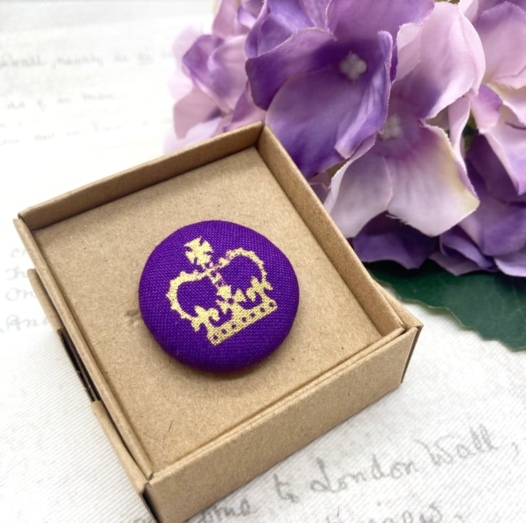 For this brooch, I’ve chosen a gold crown set against a lovely purple background and created a 28mm flat back button and added some toy filling to create a nice dome.