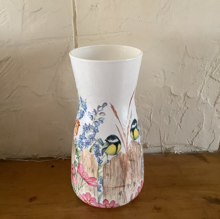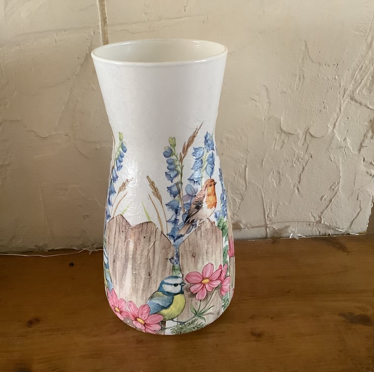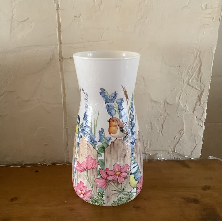 This is a glass vase that has been painted, decoupaged with a Country garden design.