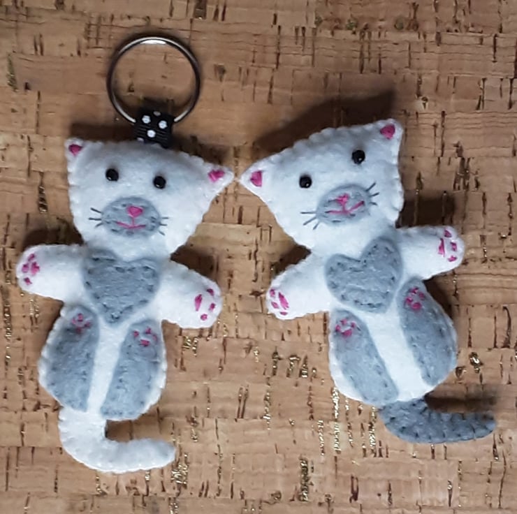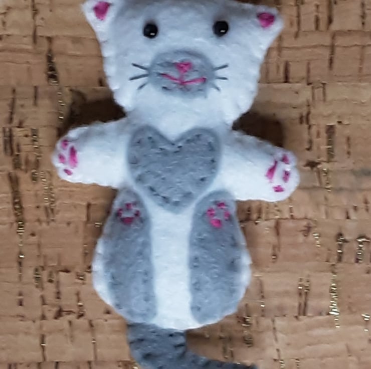 The main colours of the cat are white with light grey legs, tail, chest, muzzle. The eyes are made from black seed beads. Mouth, nose & paws are stitched in pink thread. The whiskers are stitched in grey thread.