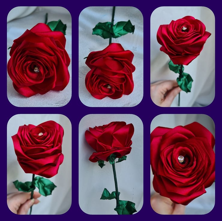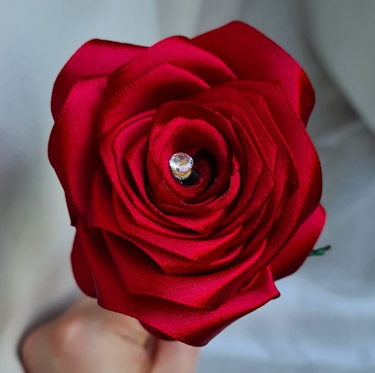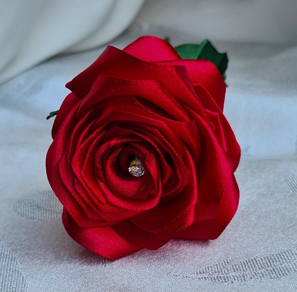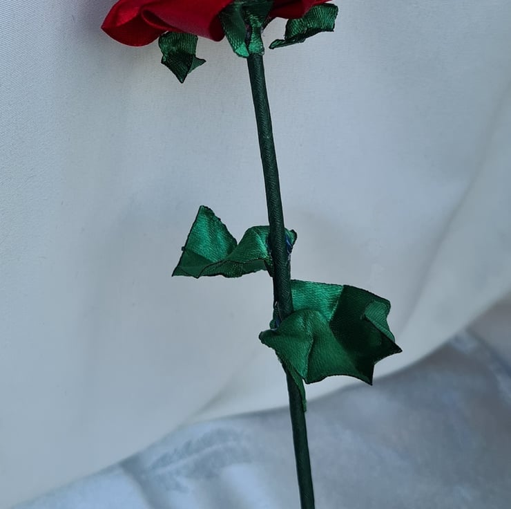 A gorgeous handmade single stem rose (one flower only), made with beautiful Burgundy Red Satin (Polyester) ribbon. The stem is made from bamboo (Non-bendy) and wrapped in Green florist tape with Dark Green Satin ribbon leaves. A gorgeous artificial flower gift.