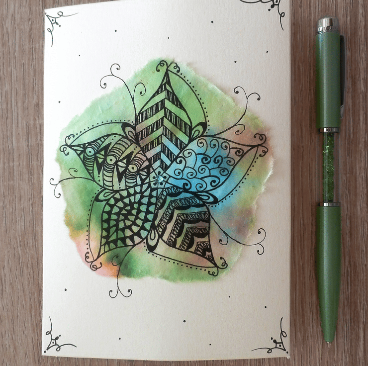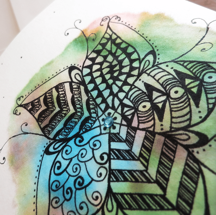 Hand drawn card with a doodle-style flower. The flower design is drawn in black archival ink over rice paper that has been hand dyed in shades of blue, green and orange. A blue coloured gem in the centre completes the flower. The design process means that each card is a one-off. This card is blank so can be used for any occasion.