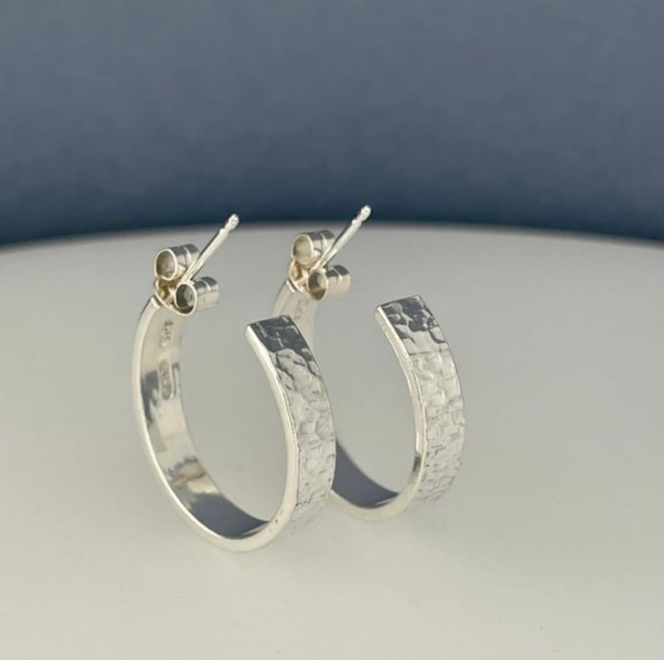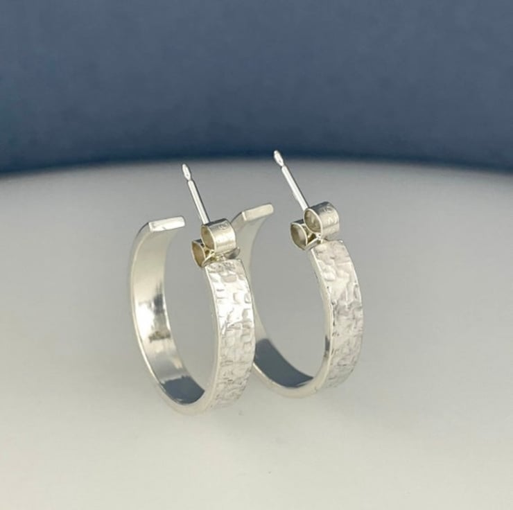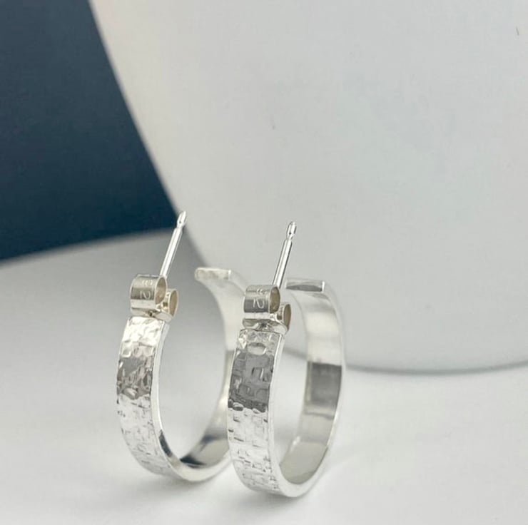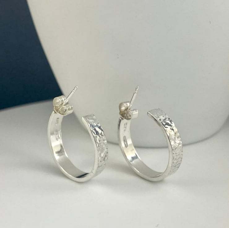 A lovely pair of chunky hoop earrings handmade from 925 sterling sterling silver. Cut by hand from 1.3mm thick/4mm wide silver rectangular wire, formed into circular shapes then hammered to create their unique attractive sparkly textured surface.