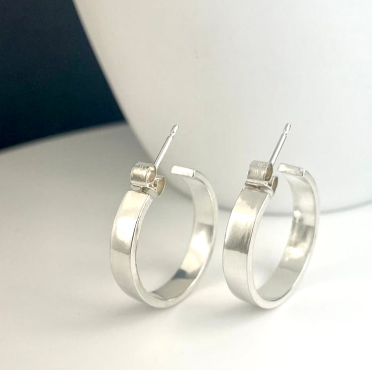 A lovely pair of chunky hoop earrings handmade from 925 sterling silver. Cut by hand from solid 1.3mm thick/4mm wide silver rectangular wire, formed into circular shapes then worked to a plain smooth surface. They have long silver pin fittings and are secured with stamped (925) silver scroll’s/butterfly’s.