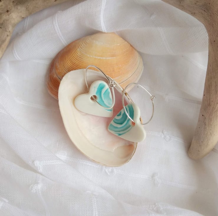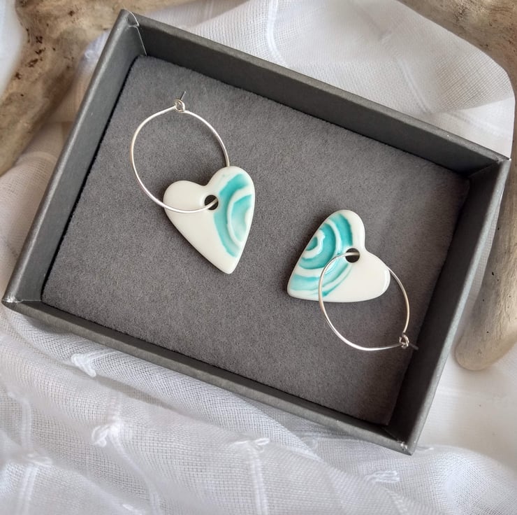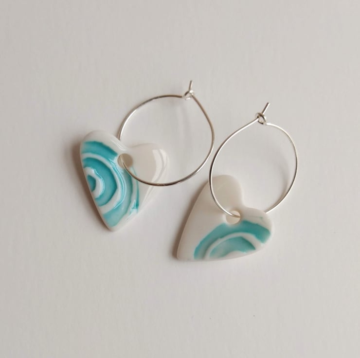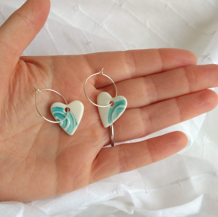Handmade porcelain heart charms with an impressed turquoise wave design. The hearts are glazed to a glossy shine on the front face with a smooth, matt tactile finish on the reverse. The hearts hang on delicate 20mm sterling silver hoops.
